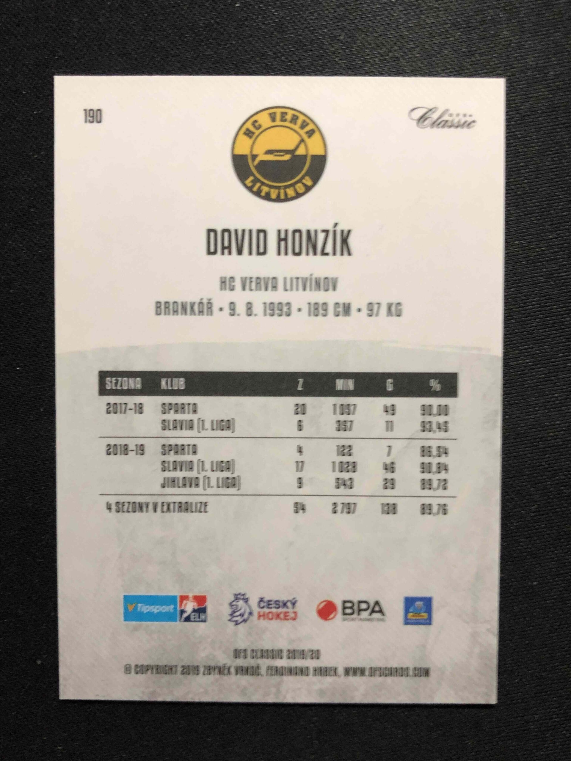 Sběratelská karta 2019/2020 OFS Classic Base 190 David Honzík