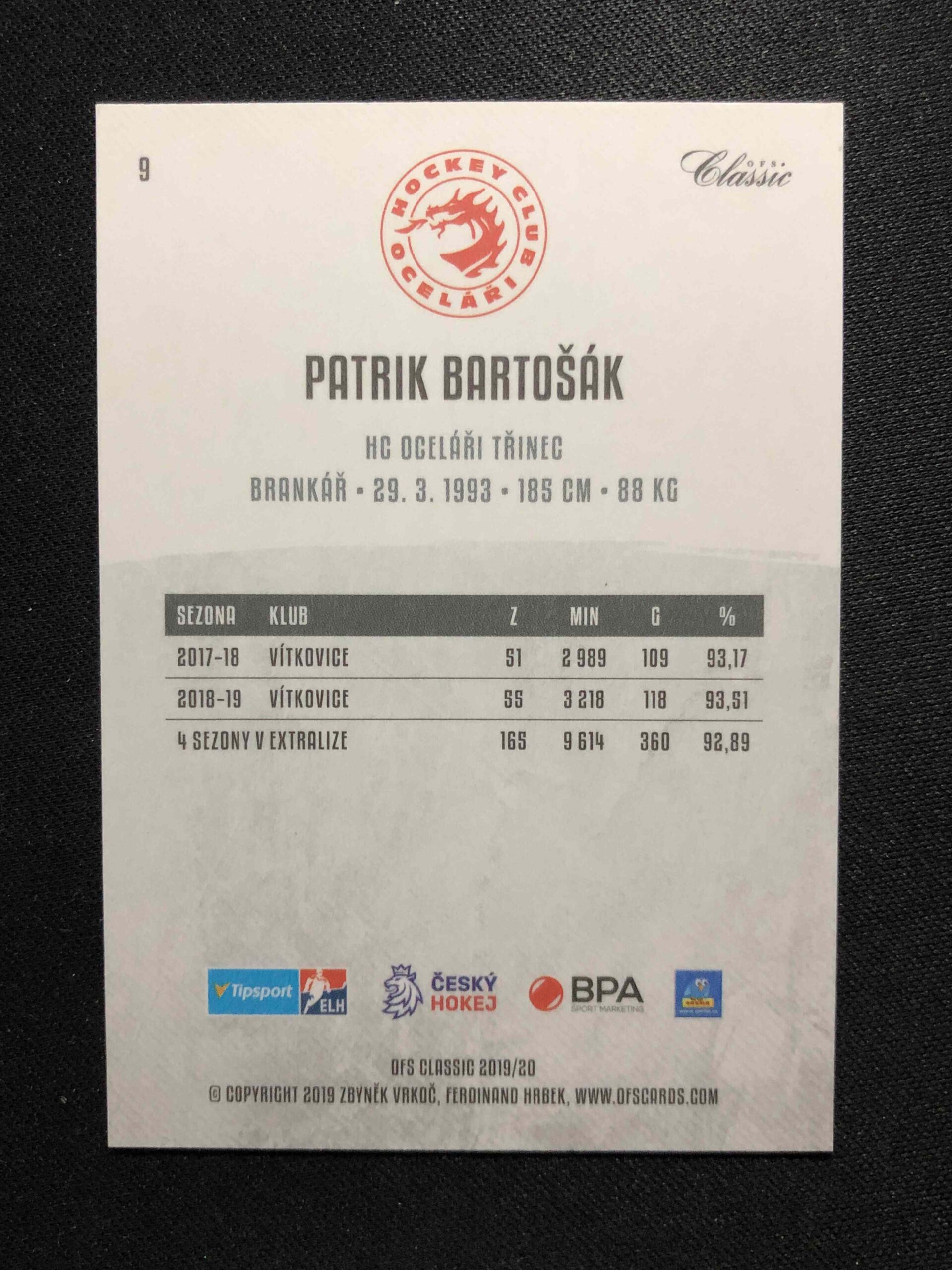 Sběratelská karta 2019/2020 OFS Classic Silver Sand 9 Patrik Bartošák Paralel 02/19