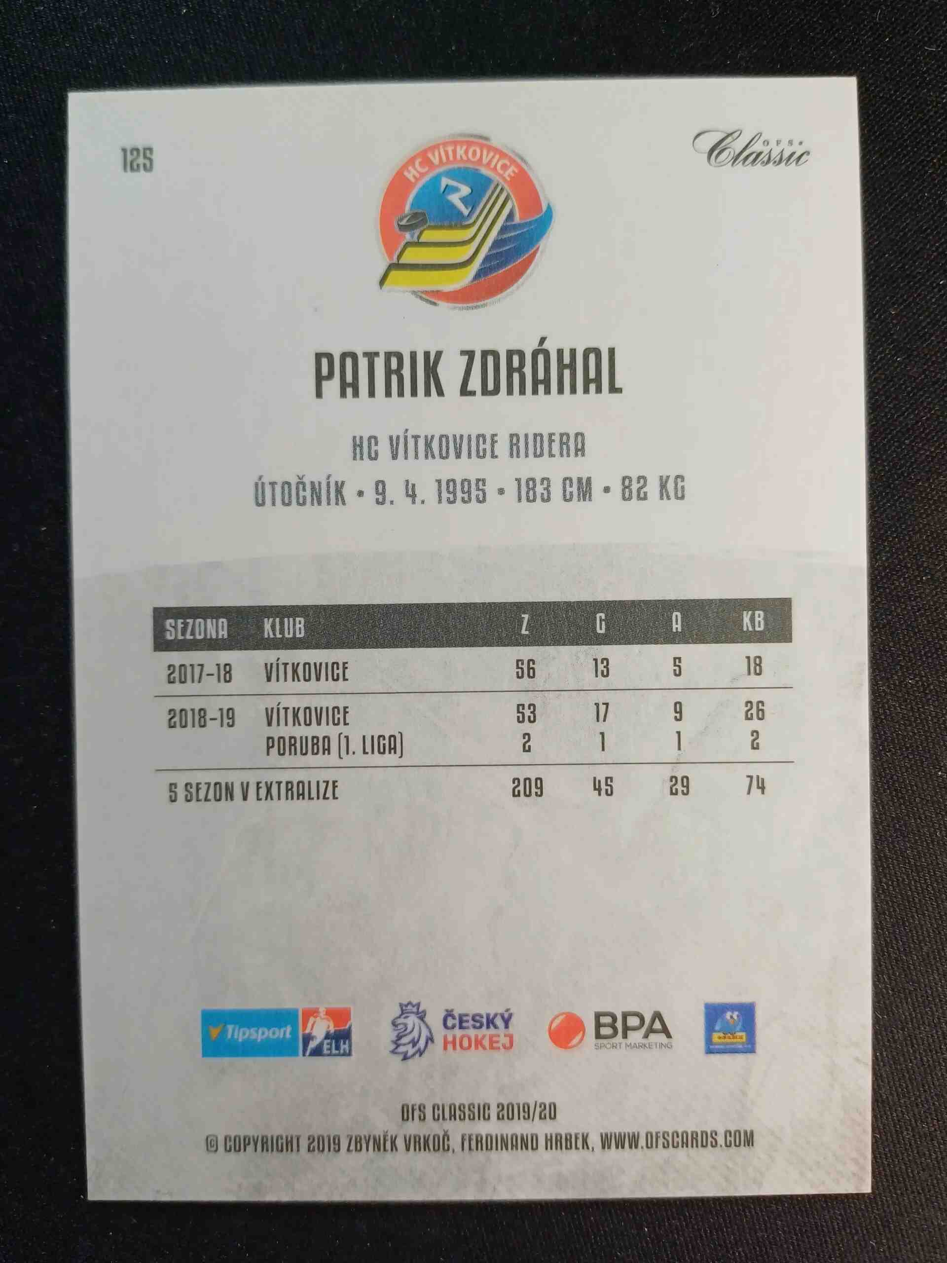 Sběratelská karta 2019/2020 OFS OFS Classic Silver 125 Patrik Zdráhal Paralel