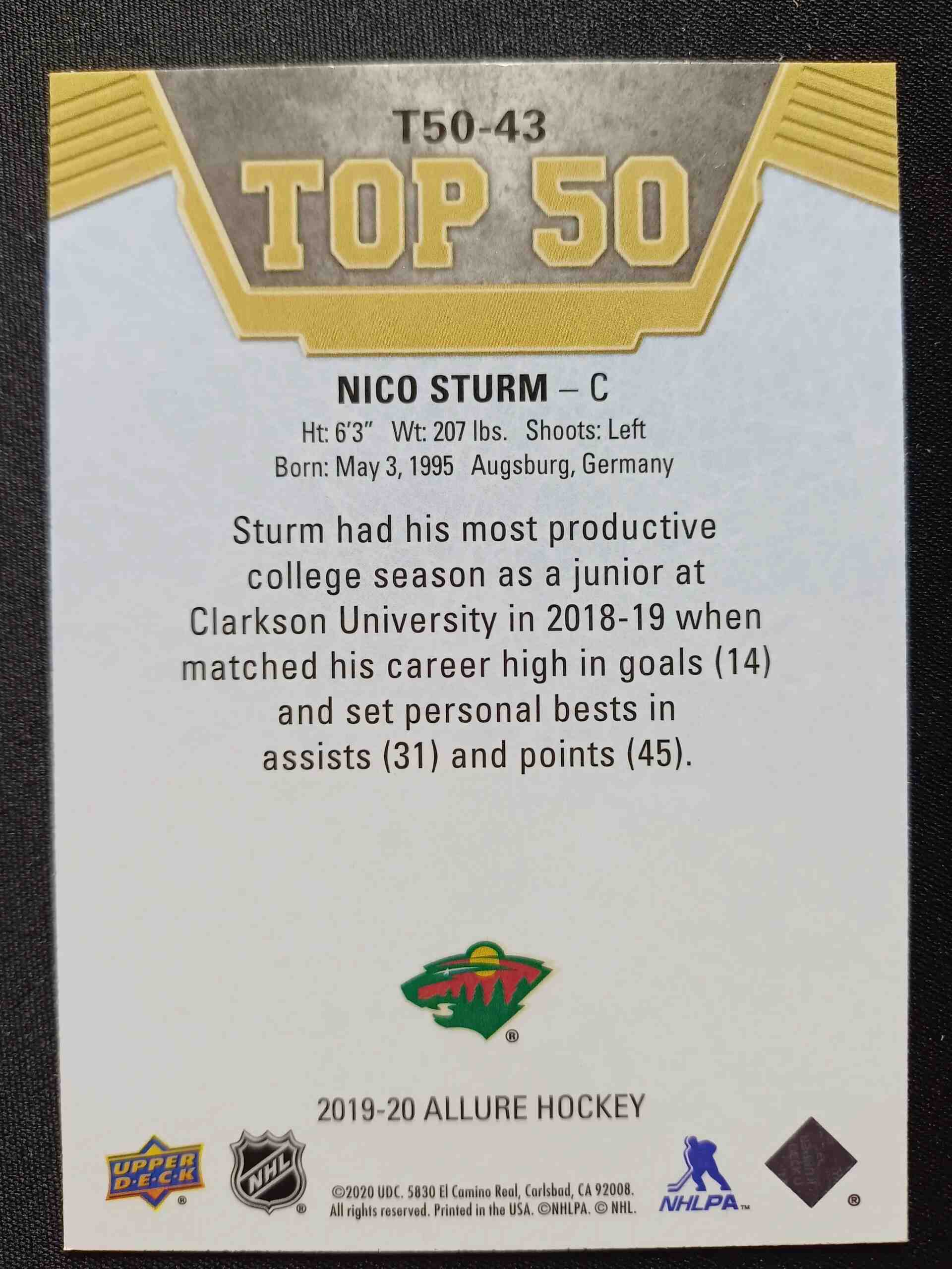 Sběratelská karta 2019/2020 Upper Deck Allure Top 50 T50-43 Nico Sturm Inzert