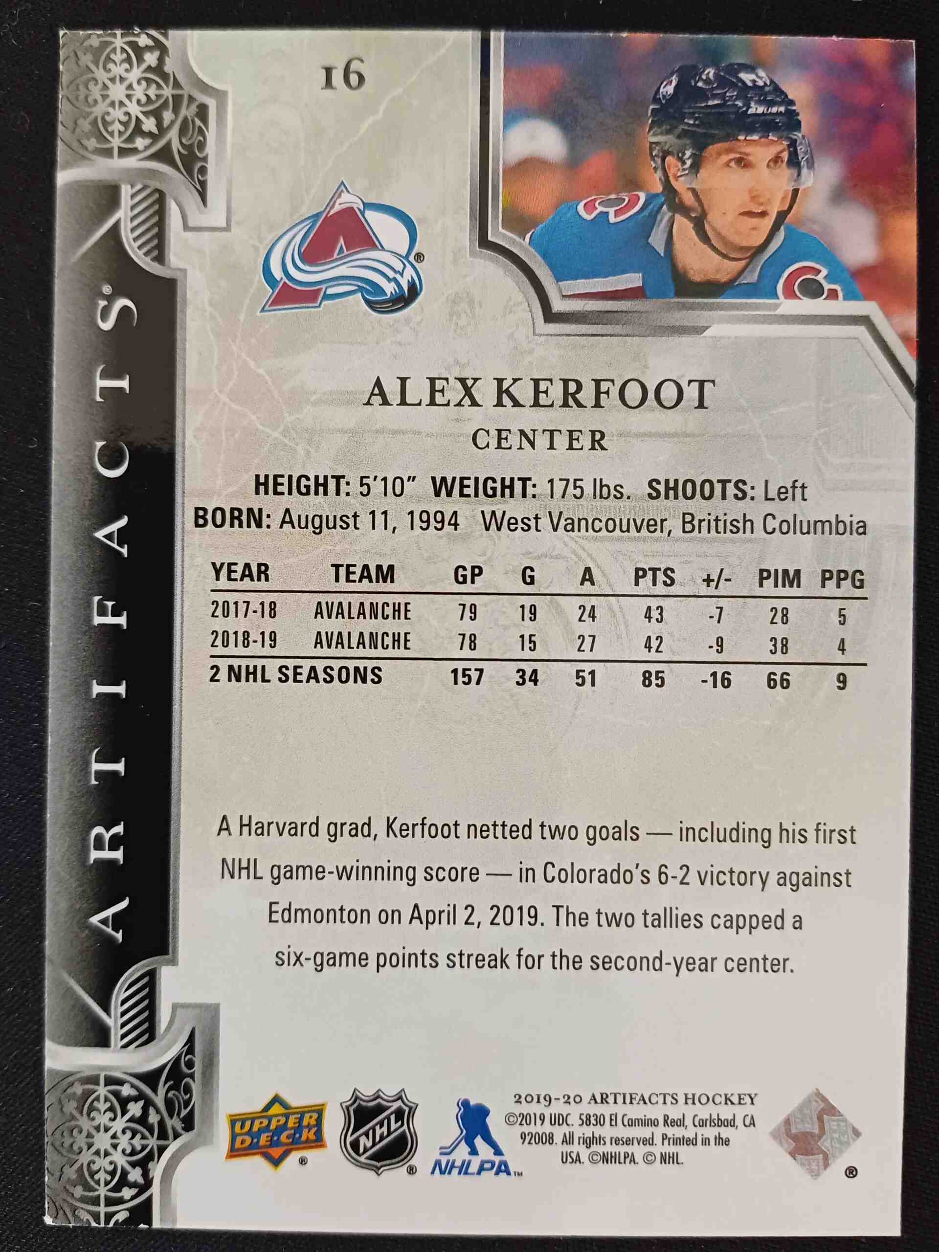 Sběratelská karta 2019/2020 Upper Deck Artifacts Aqua 16 Alex Kerfoot Paralel 02/45