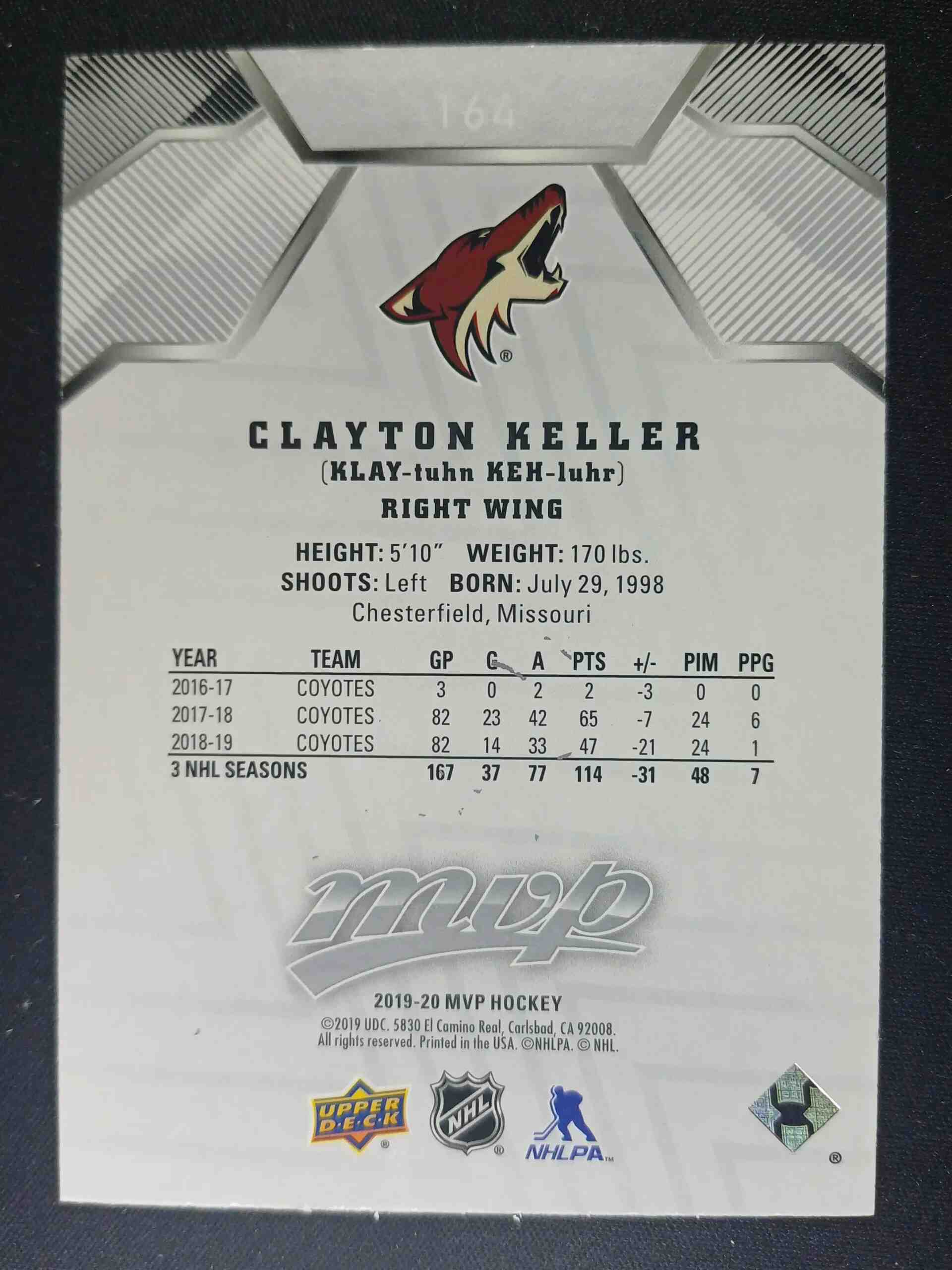 Sběratelská karta 2019/2020 Upper Deck MVP Super Script 164 Clayton Keller Paralel 18/25