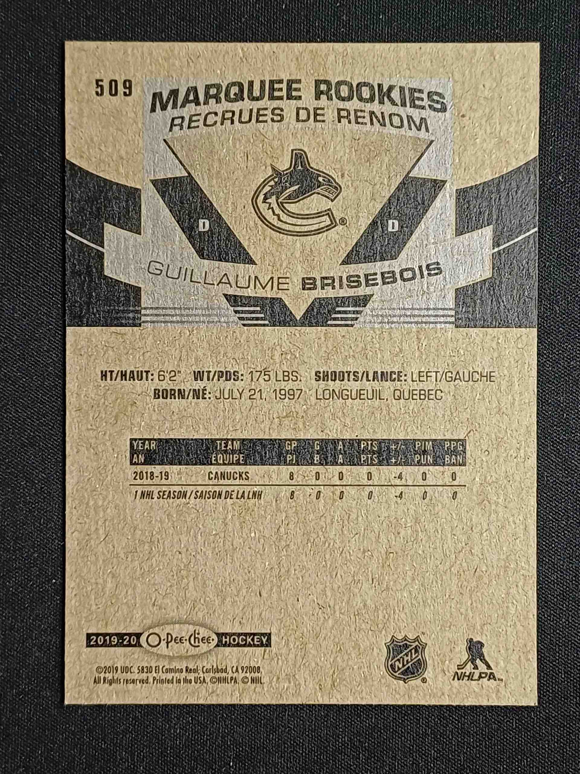 Sběratelská karta 2019/2020 Upper Deck O-Pee-Chee Marquee Rookie 509 Guillaume Brisebois