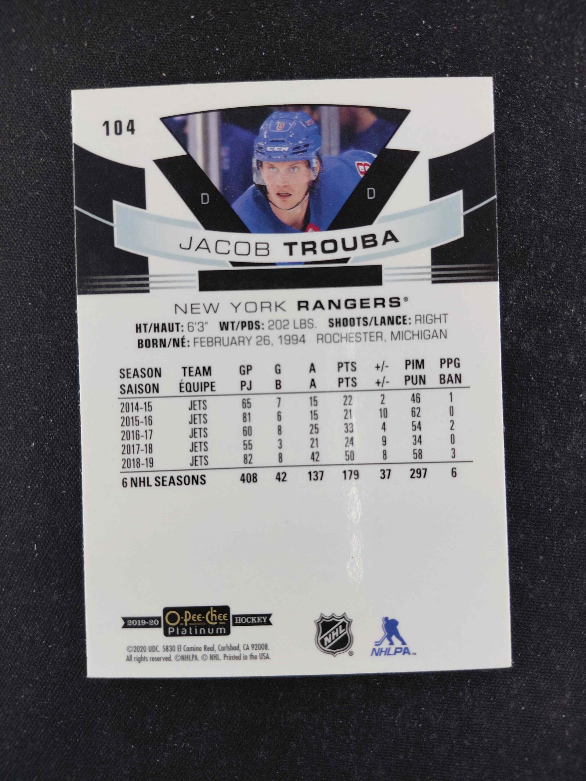 Sběratelská karta 2019/2020 Upper Deck OPC Platinum Base 104 Jacob Trouba