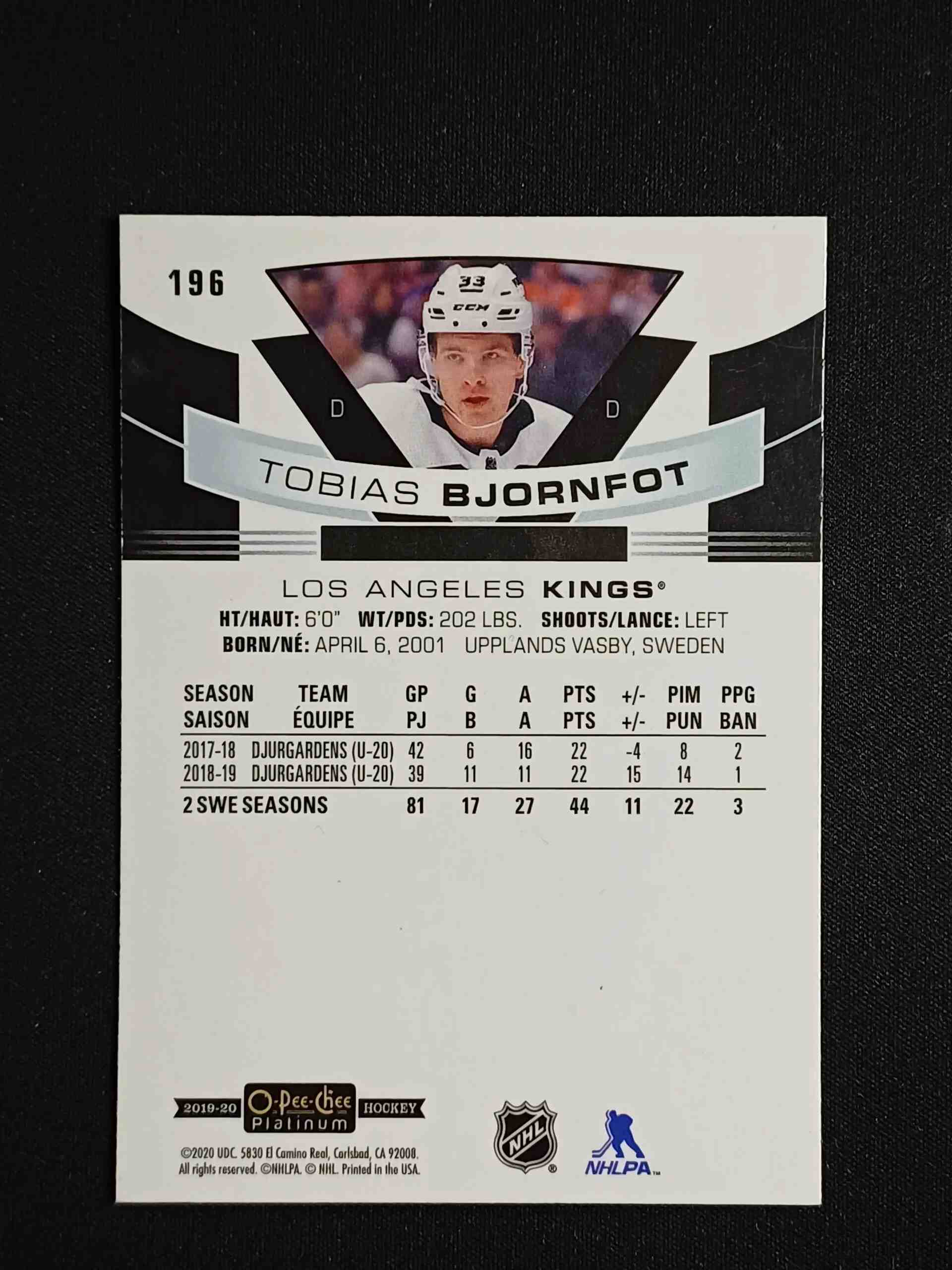 Sběratelská karta 2019/2020 Upper Deck OPC Platinum Base 196 Tobias Bjornfot