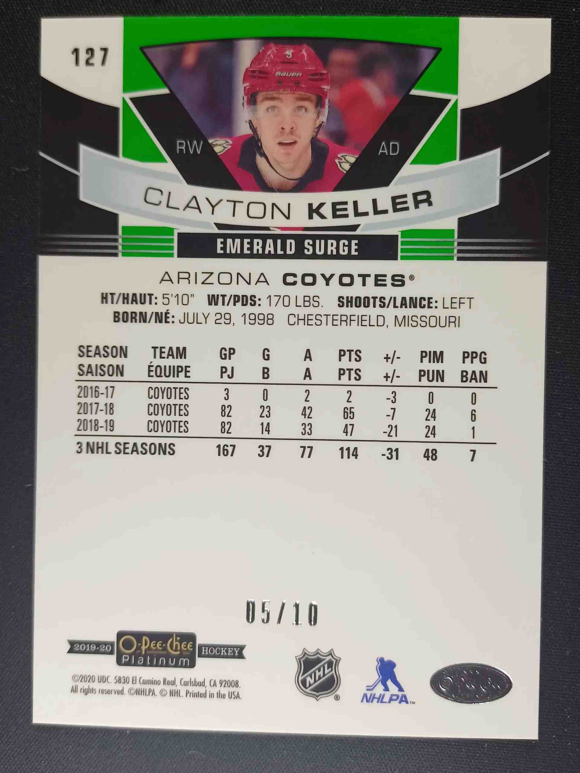 Sběratelská karta 2019/2020 Upper Deck OPC Platinum Emerald Surge 127 Clayton Keller Paralel 05/10