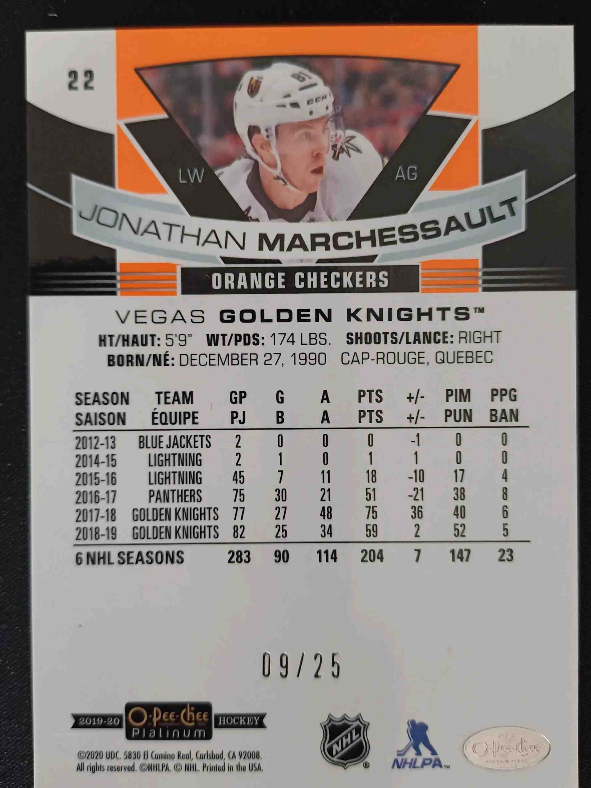 2019/2020 Upper Deck OPC Platinum Orange Checkers 22 Jonathan Marchessault Paralel 09/25