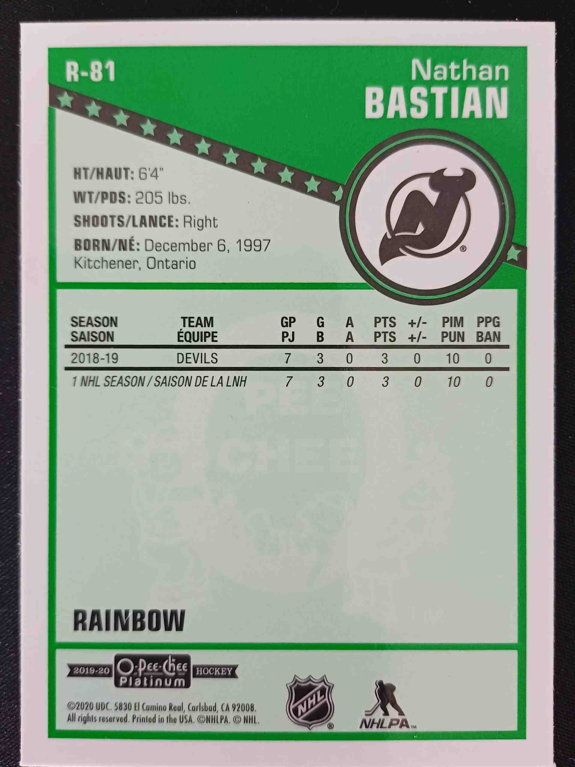 2019/2020 Upper Deck OPC Platinum Retro Rainbow Marquee Rookie R-81 Nathan Bastian Paralel