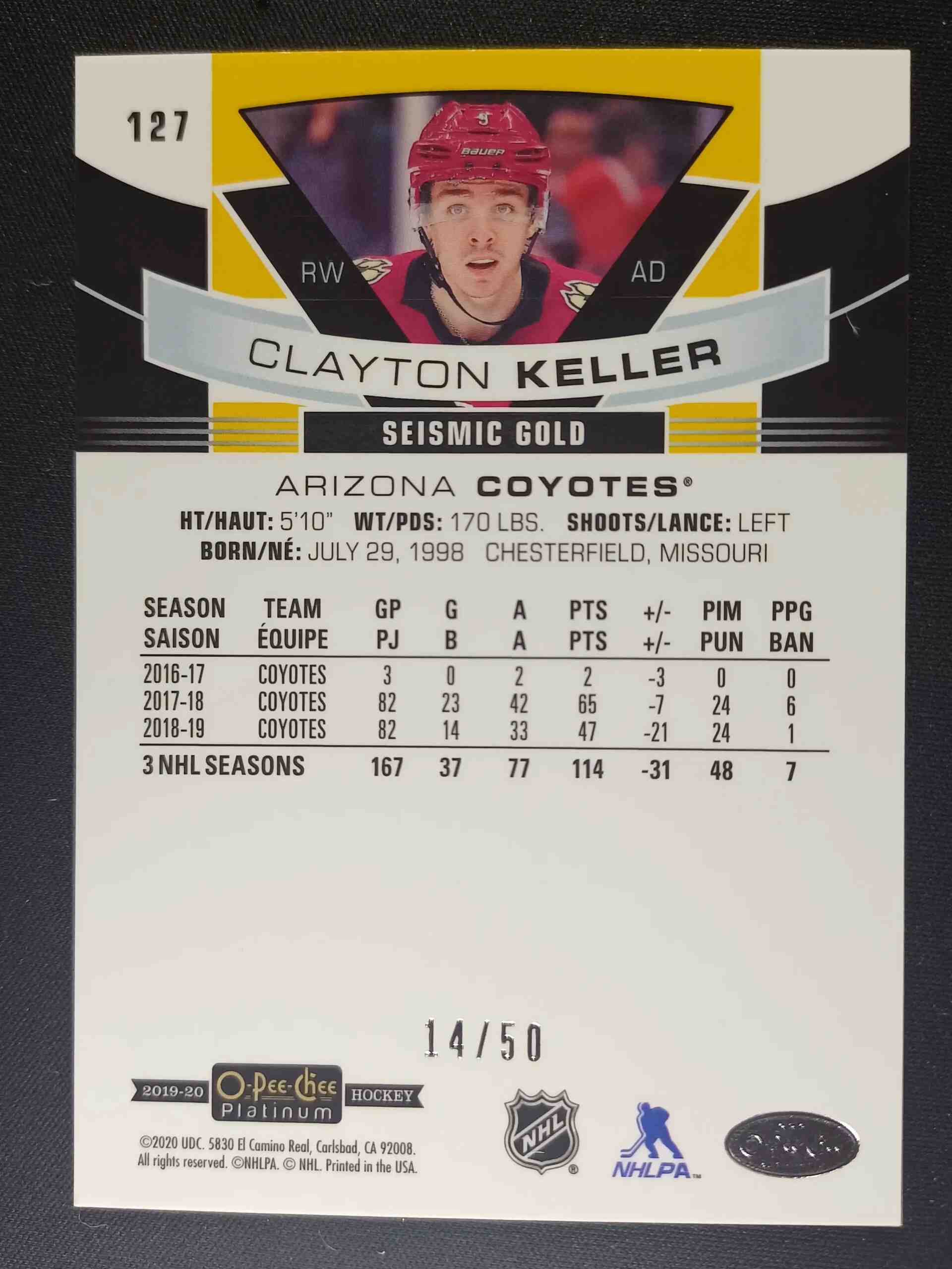 Sběratelská karta 2019/2020 Upper Deck OPC Platinum Seismic Gold 127 Clayton Keller Paralel 14/50