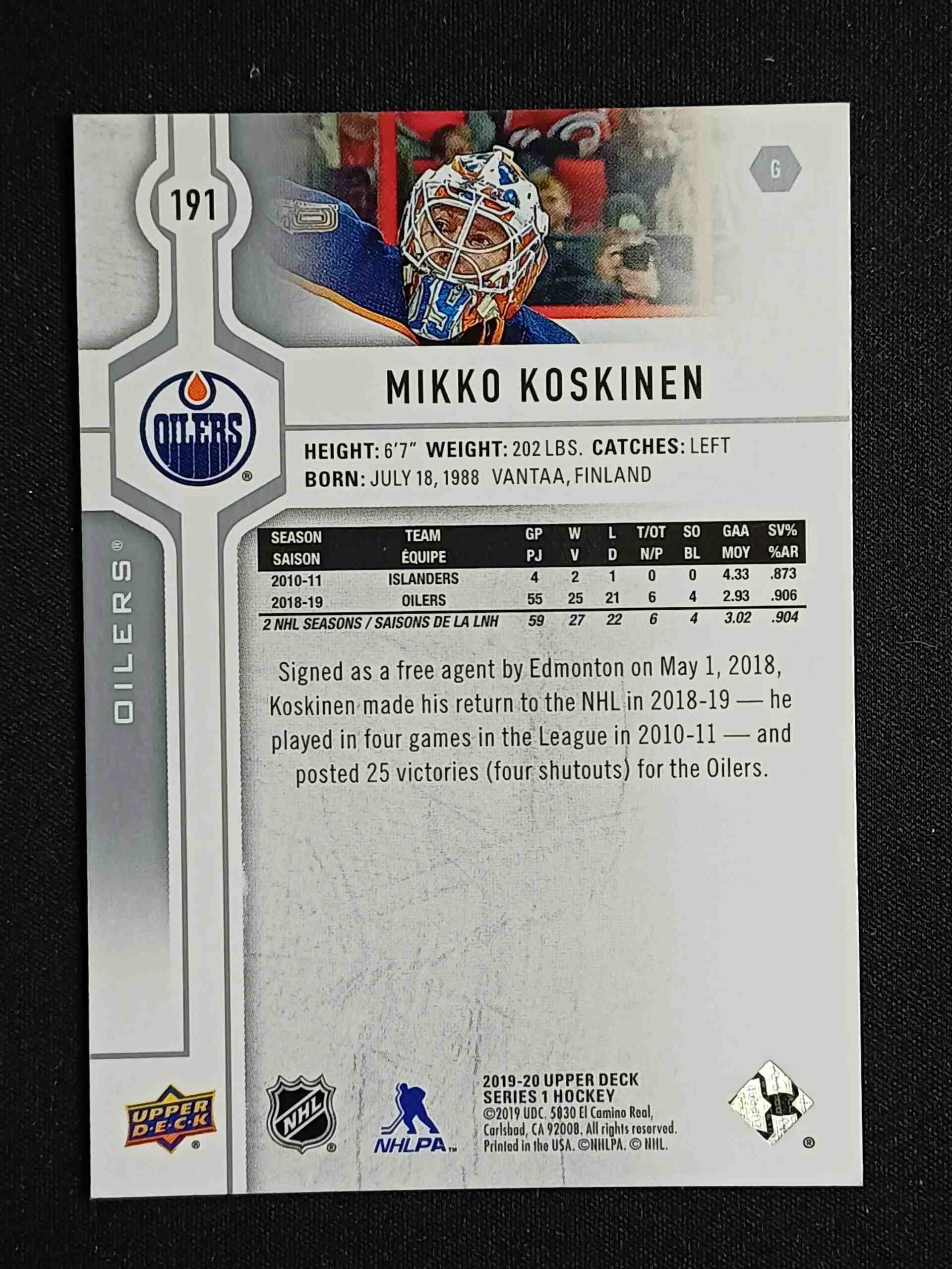 Sběratelská karta 2019/2020 Upper Deck Series 1 Base 191 Mikko Koskinen