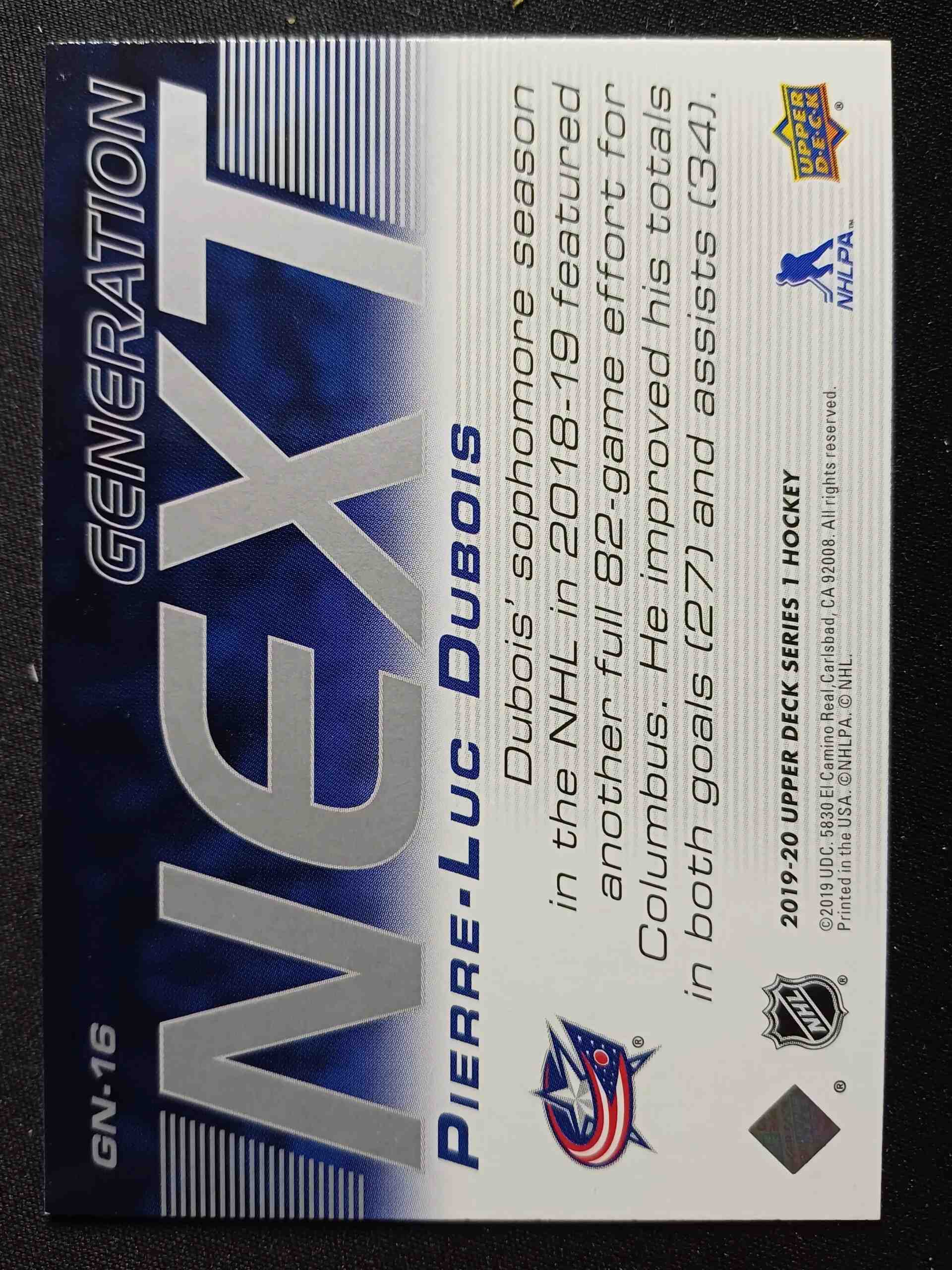 Sběratelská karta 2019/2020 Upper Deck Series 1 Generation Next GN-18 Pierre-Luc Dubois Inzert