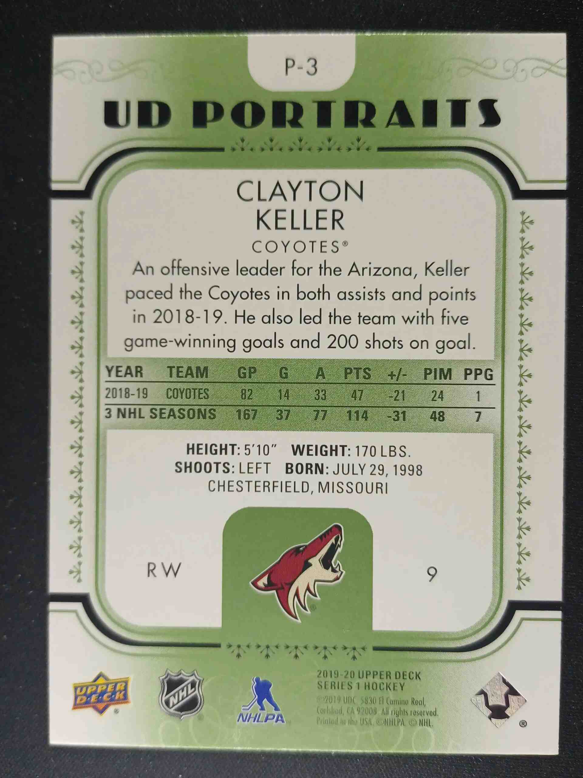 2019/2020 Upper Deck Series 1 Portraits Green P-3 Clayton Keller Inzert