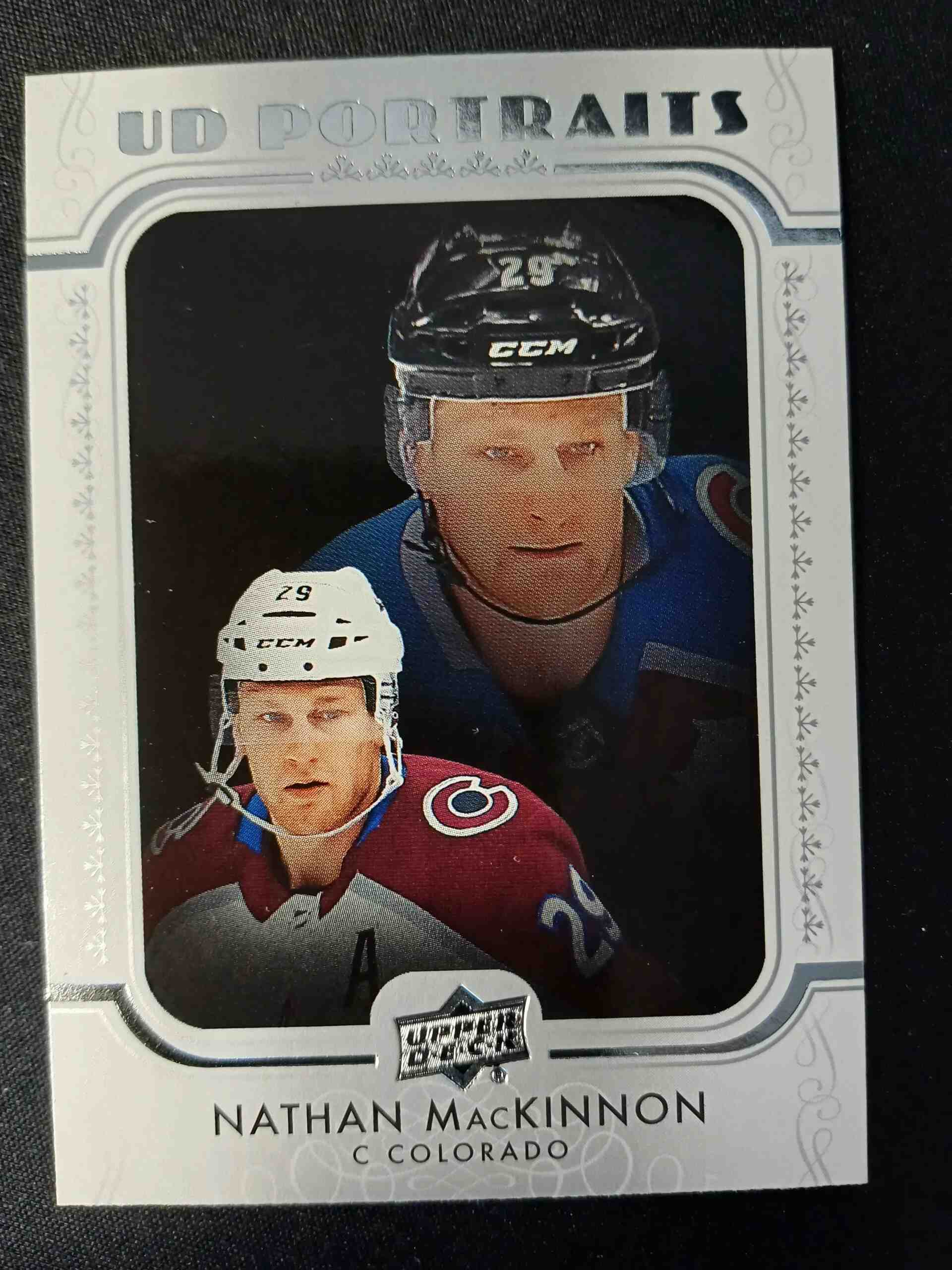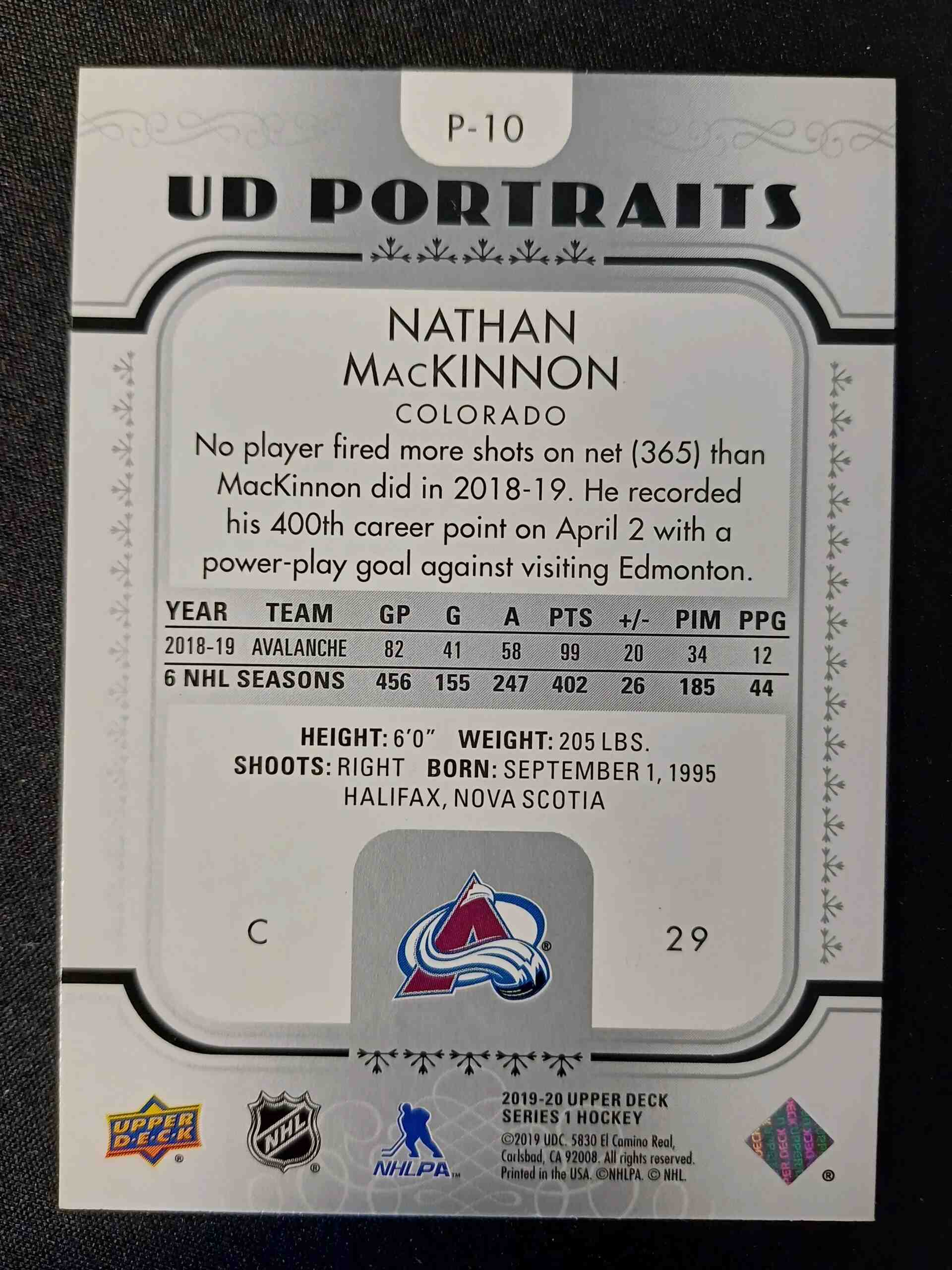 Sběratelská karta 2019/2020 Upper Deck Series 1 Portraits P-10 Nathan MacKinnon Inzert