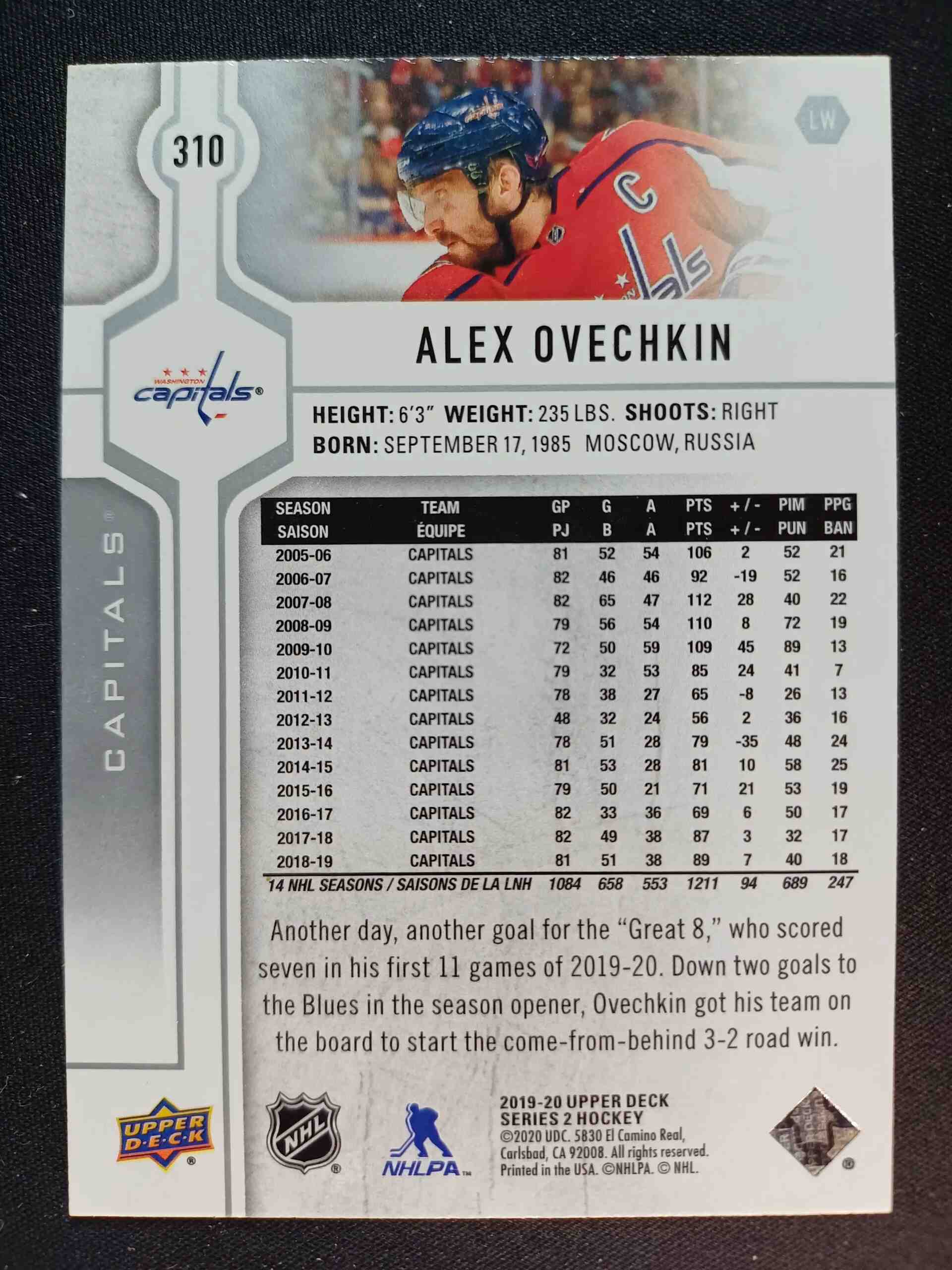 Sběratelská karta 2019/2020 Upper Deck Series 2 Base 310 Alex Ovechkin