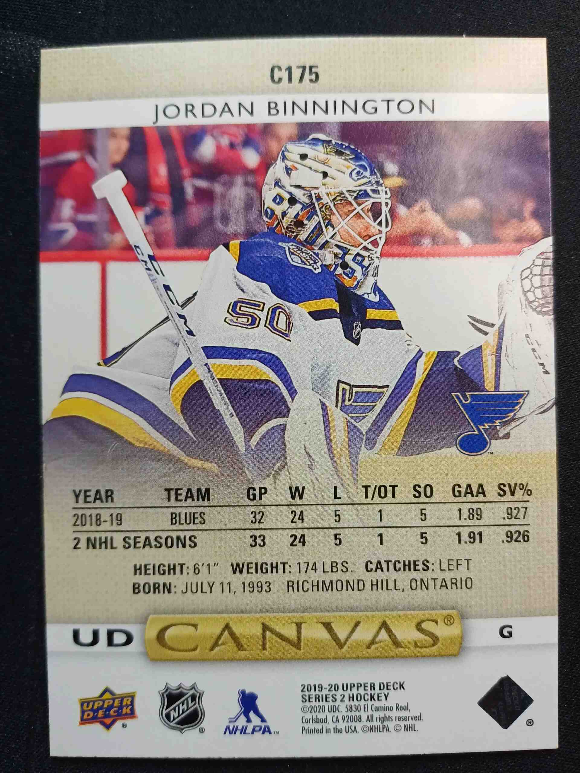 Sběratelská karta 2019/2020 Upper Deck Series 2 Canvas C175 Jordan Binnington Inzert
