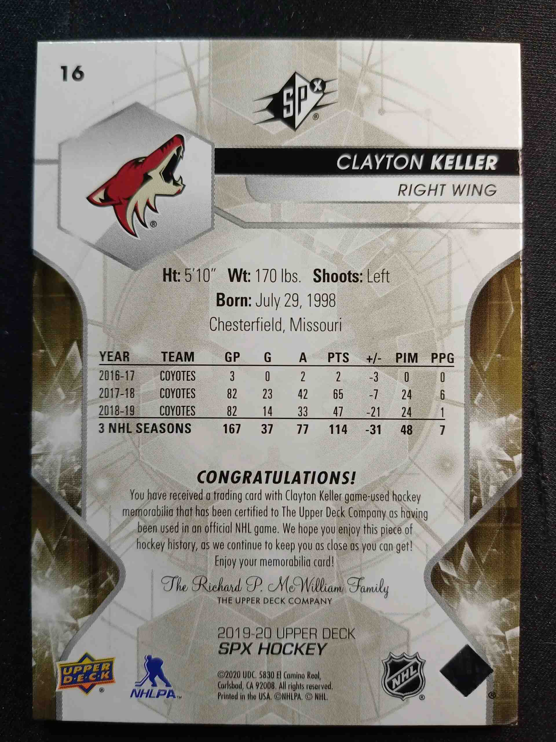 2019/2020 Upper Deck SPx Base Materials 16 Clayton Keller Jersey 113/199