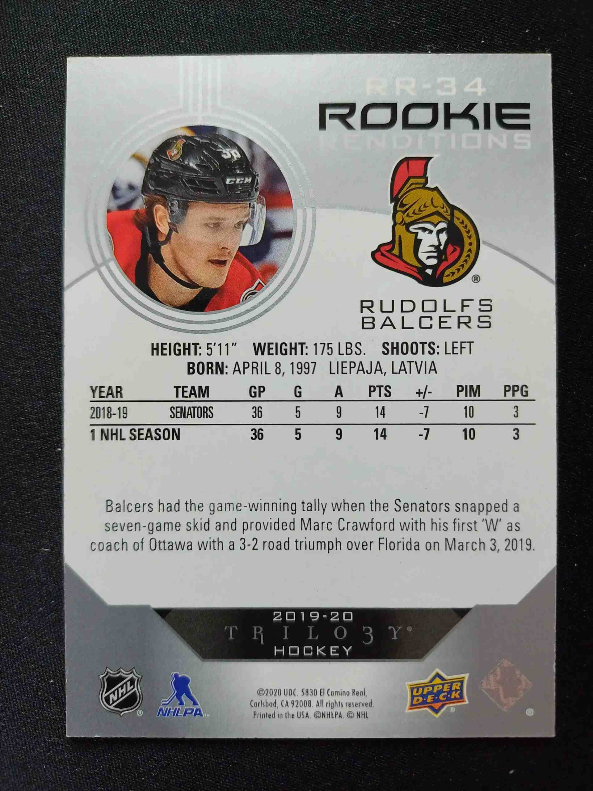 Sběratelská karta 2019/2020 Upper Deck Trilogy Rookie Renditions RR-34 Rudolfs Balcers Inzert