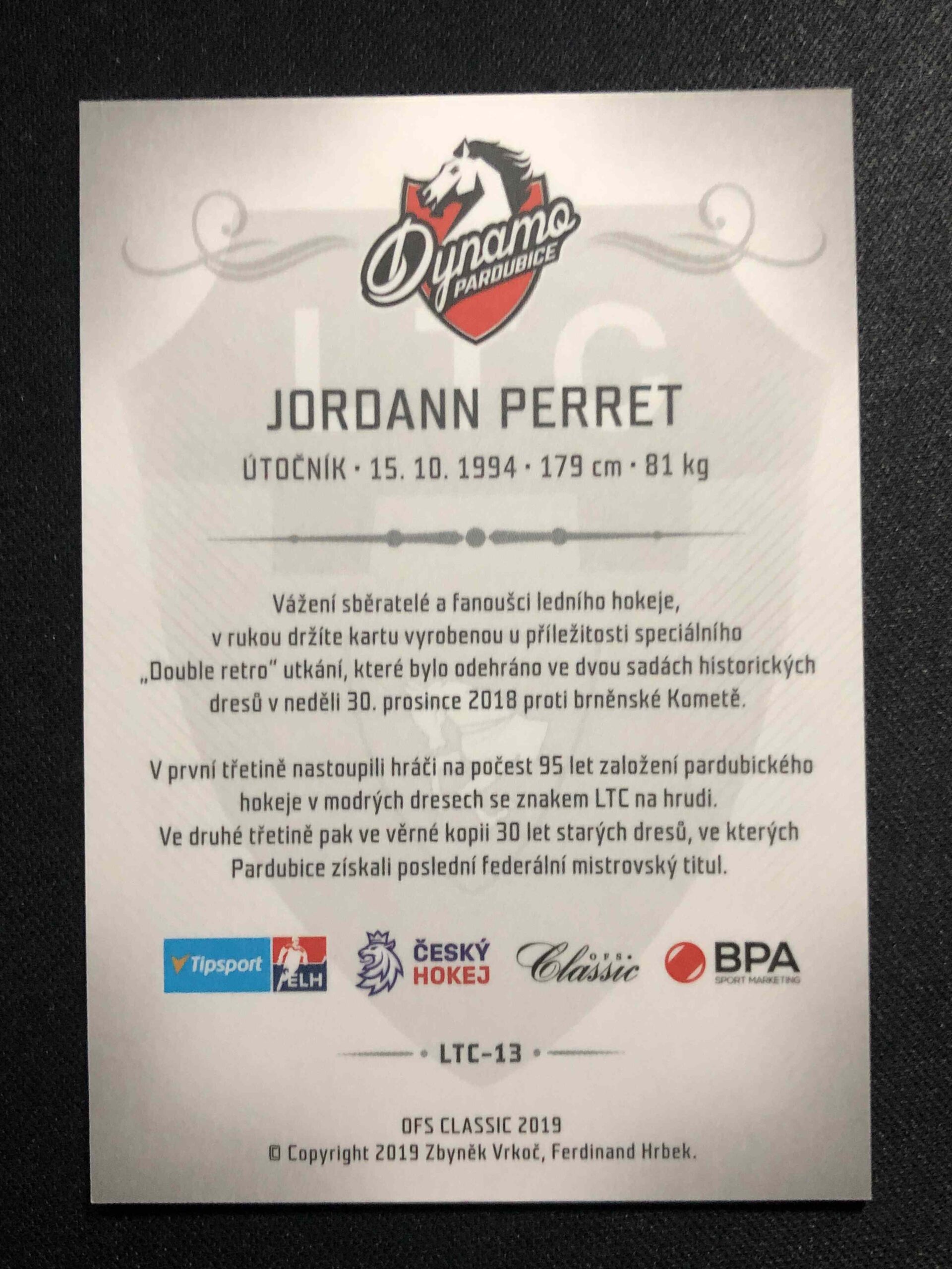 Sběratelská karta 2019 OFS Classic set HC Pardubice – dresy LTC LTC-13 Jordann Perret