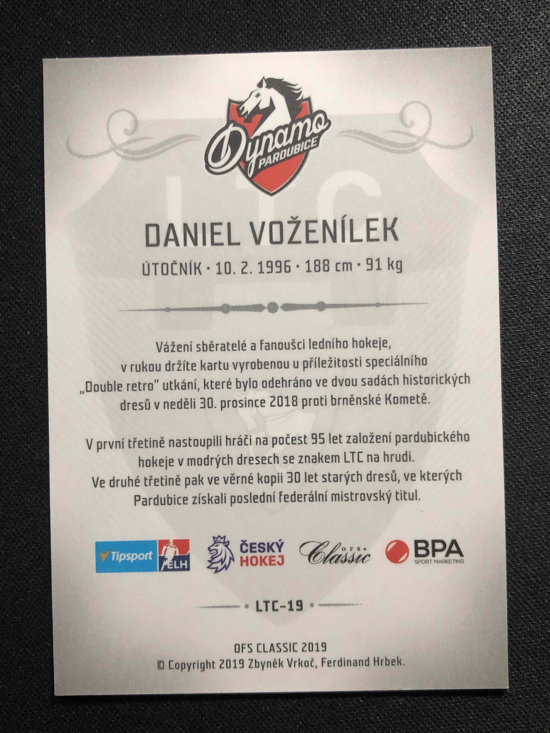 Sběratelská karta 2019 OFS Classic set HC Pardubice – dresy LTC LTC-19 Daniel Voženílek