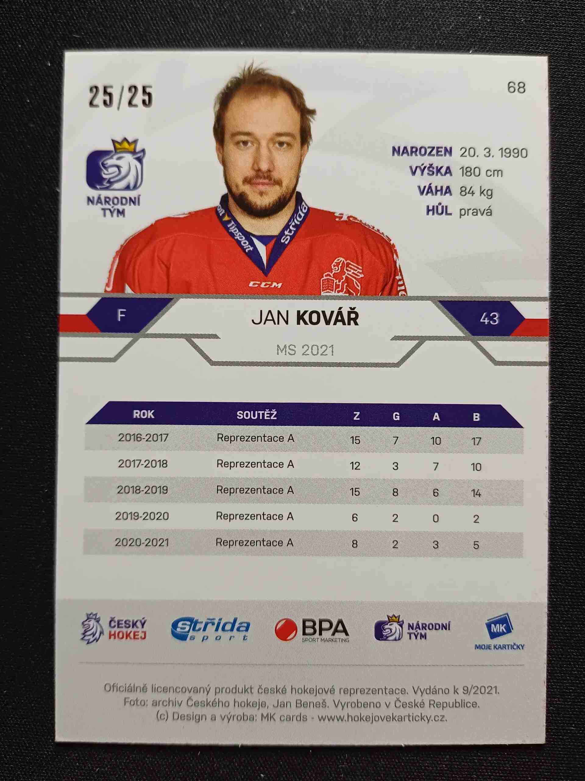 Sběratelská karta 2020/2021 Moje Kartičky Reprezentace Red 68 Jan Kovář Paralel 25/25