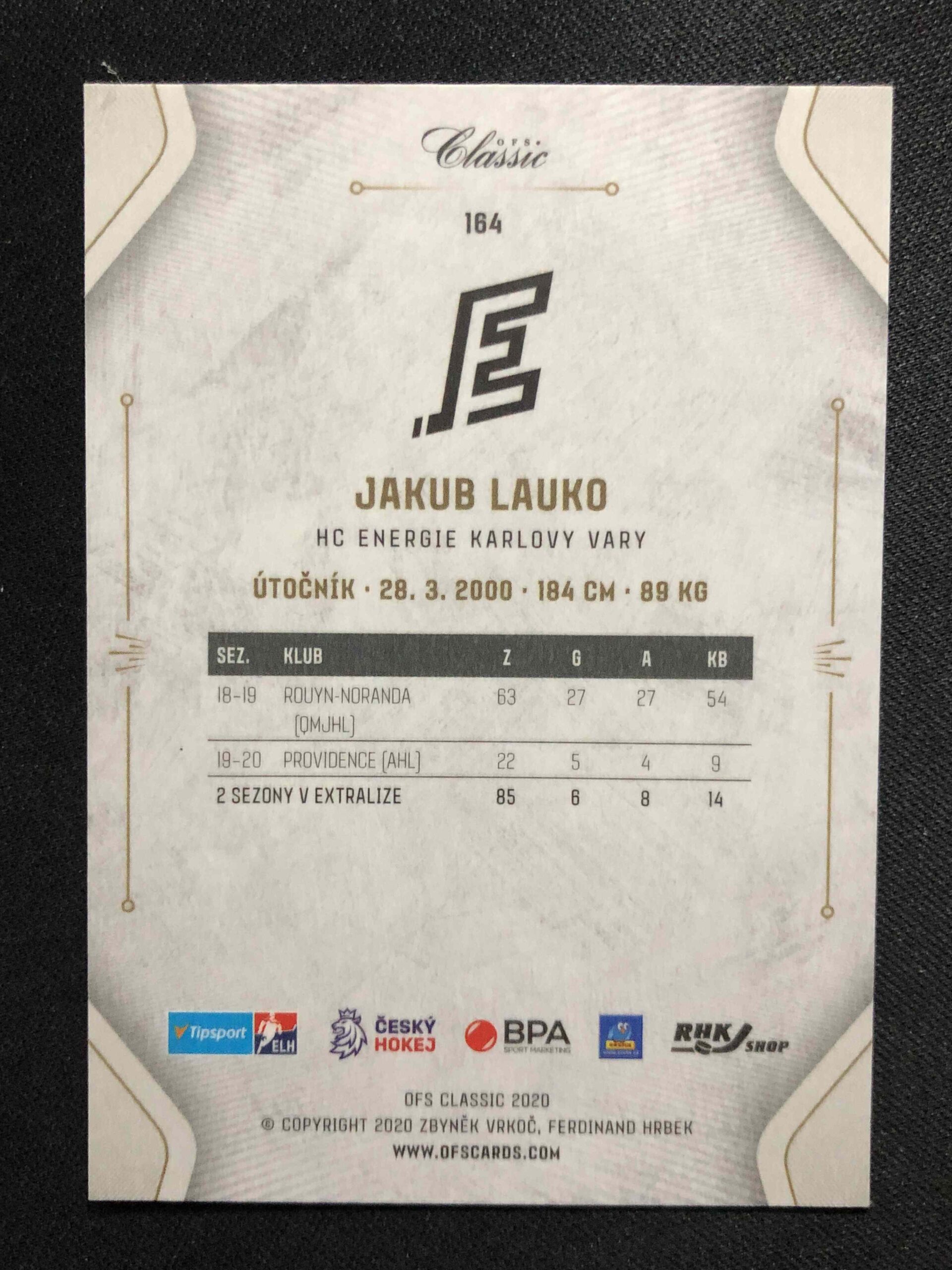 Sběratelská karta 2020/2021 OFS Classic Blue Aquadrop 164 Jakub Lauko Paralel 06/15