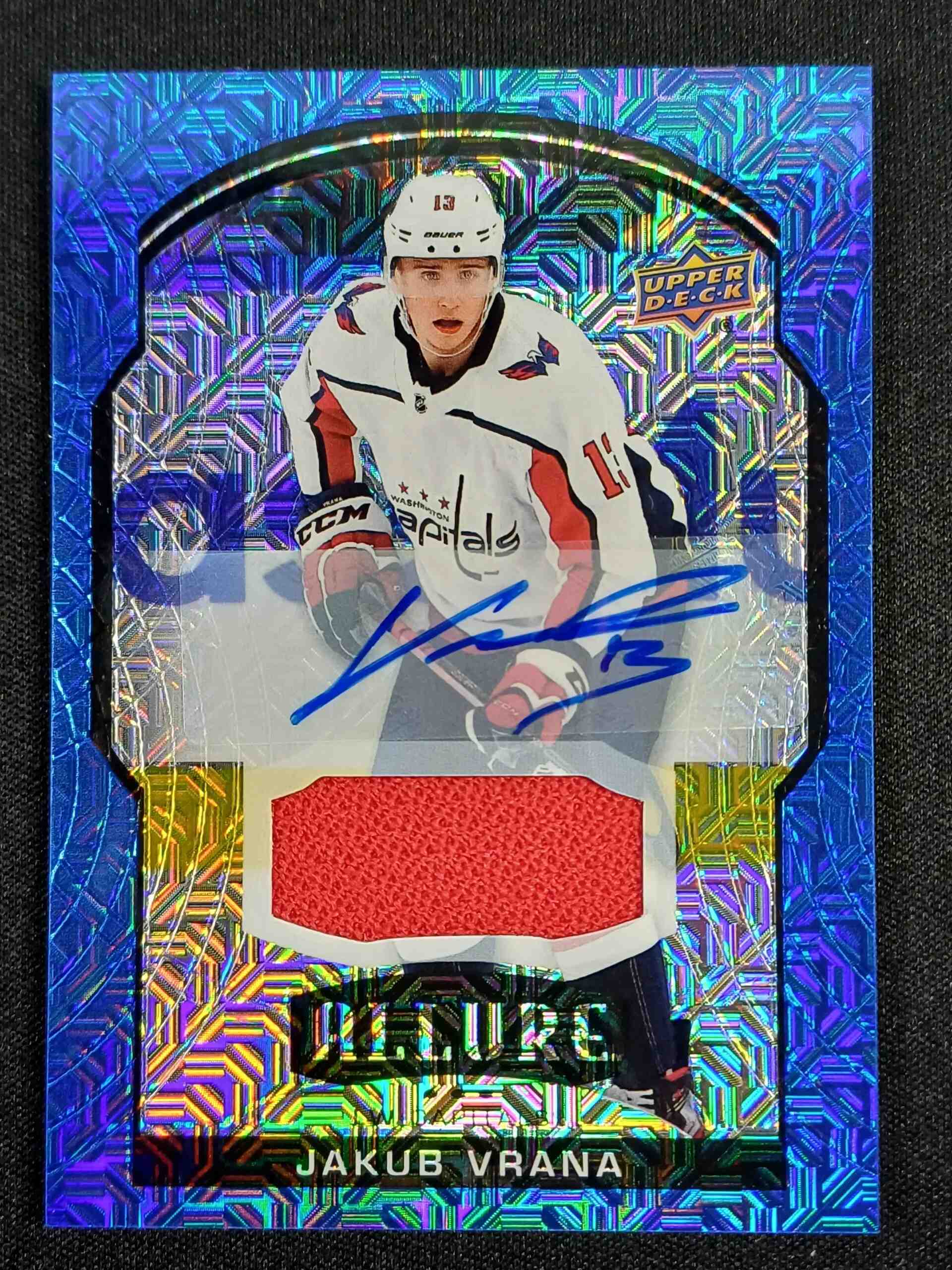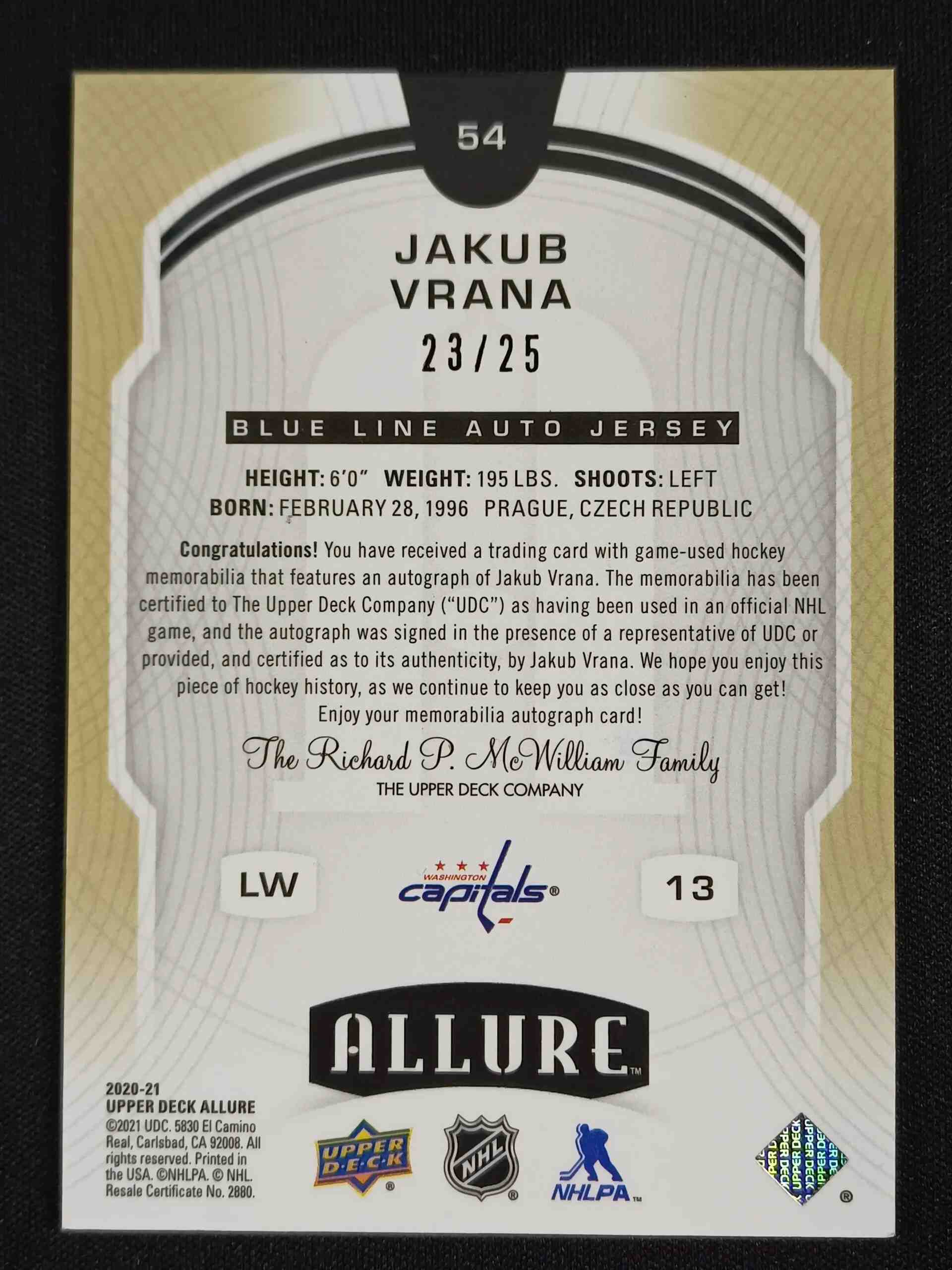 Sběratelská karta 2020/2021 Upper Deck Allure Blue Line Auto Jersey 54 Jakub Vrana AUTO Jersey 23/25