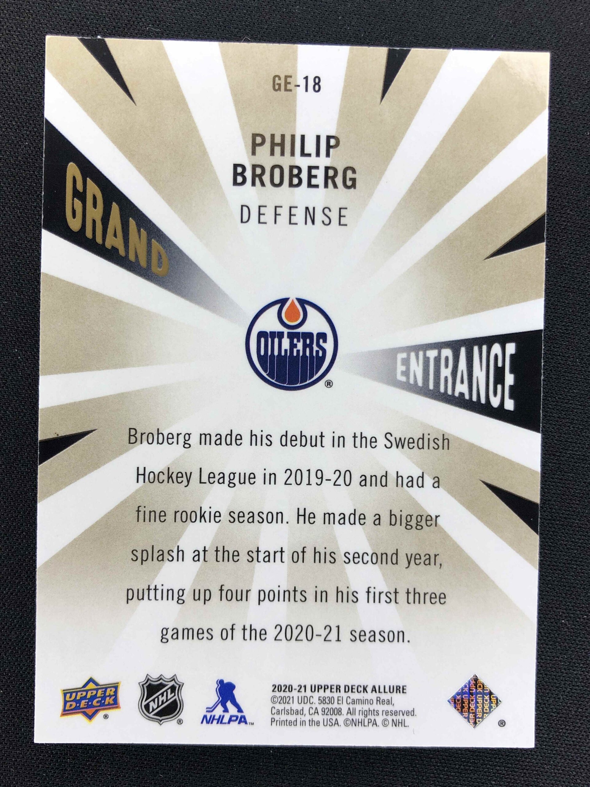 Sběratelská karta 2020/2021 Upper Deck Allure Grand Entrance GE-18 Philip Broberg Inzert