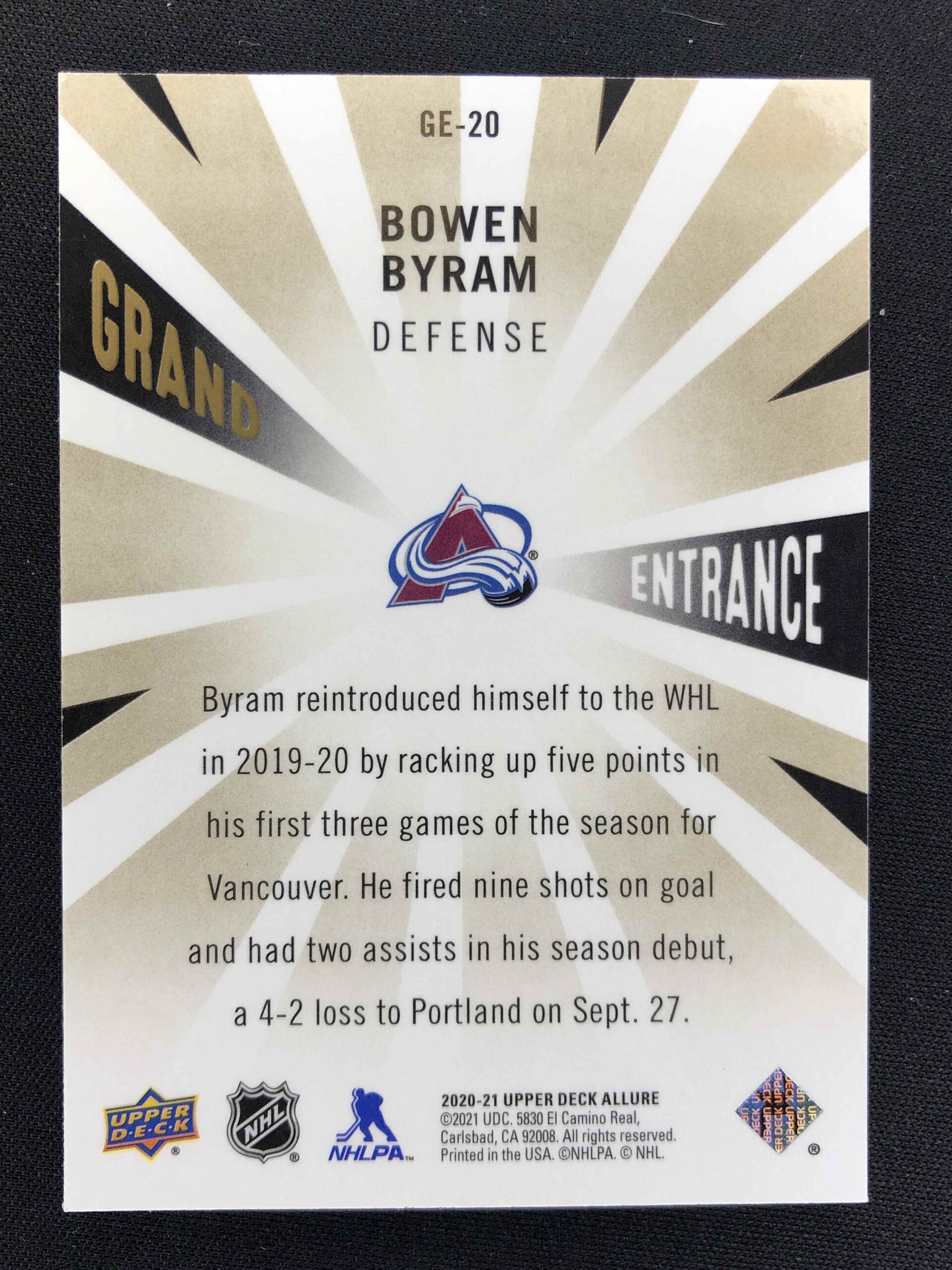 Sběratelská karta 2020/2021 Upper Deck Allure Grand Entrance GE-20 Bowen Byram Inzert