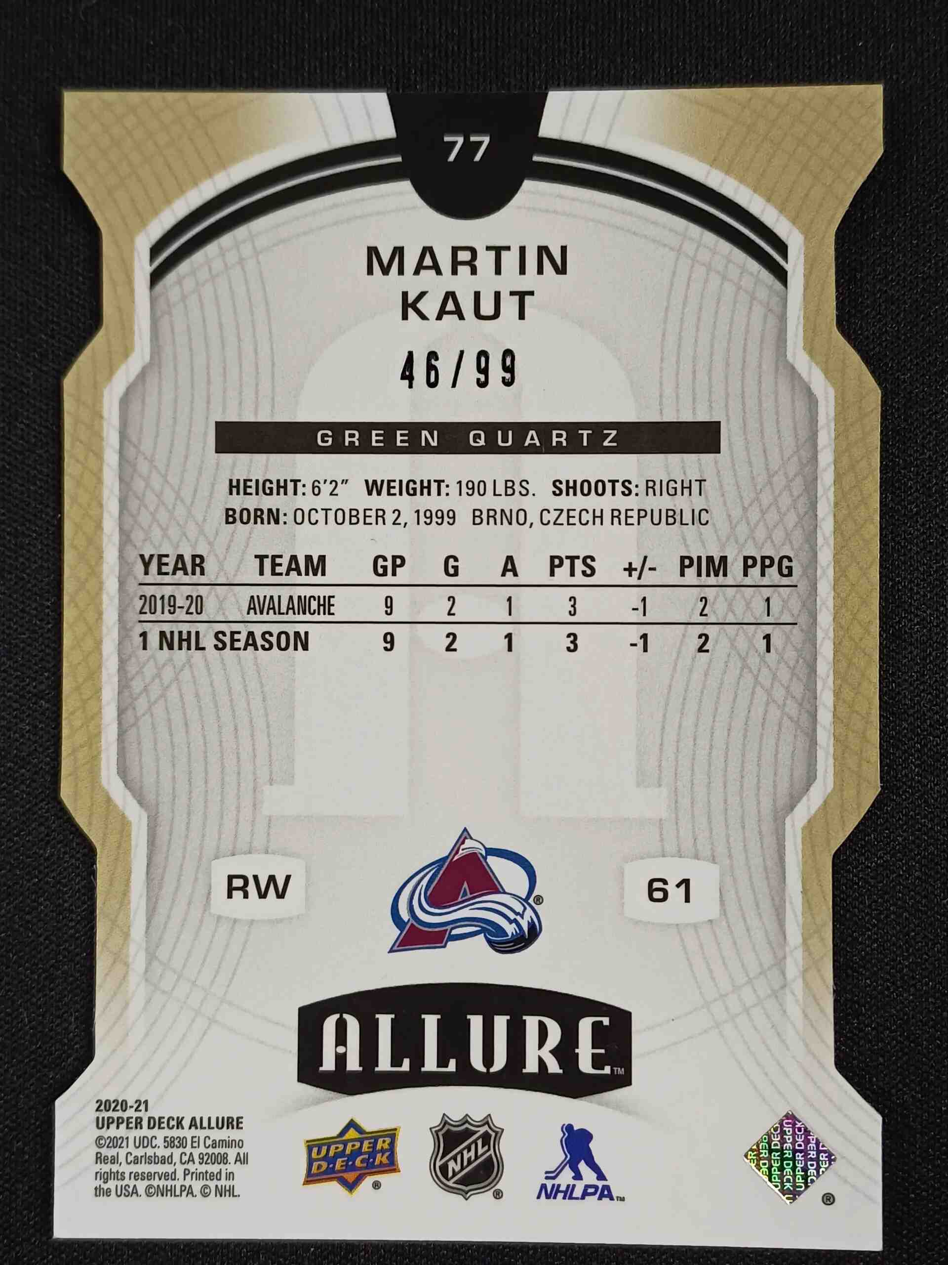 Sběratelská karta 2020/2021 Upper Deck Allure Green Quartz 77 Martin Kaut Paralel 46/99