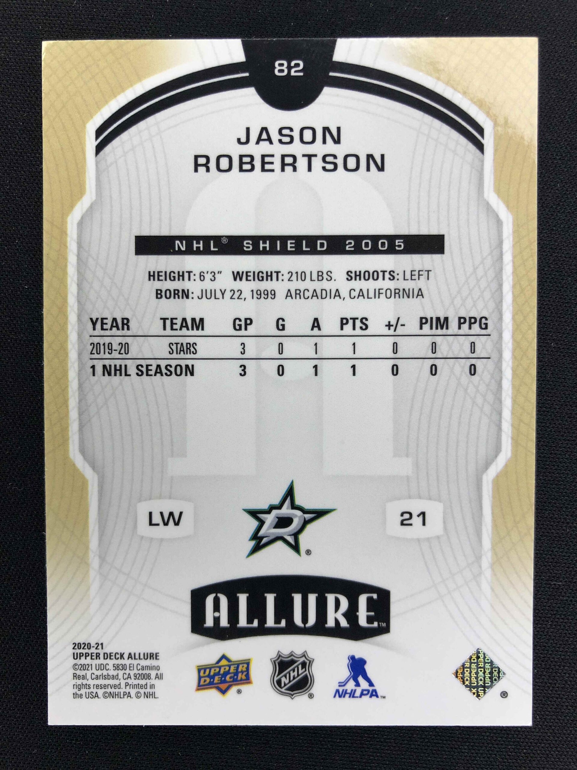 Sběratelská karta 2020/2021 Upper Deck Allure NHL Shield 2005 82 Jason Robertson Paralel