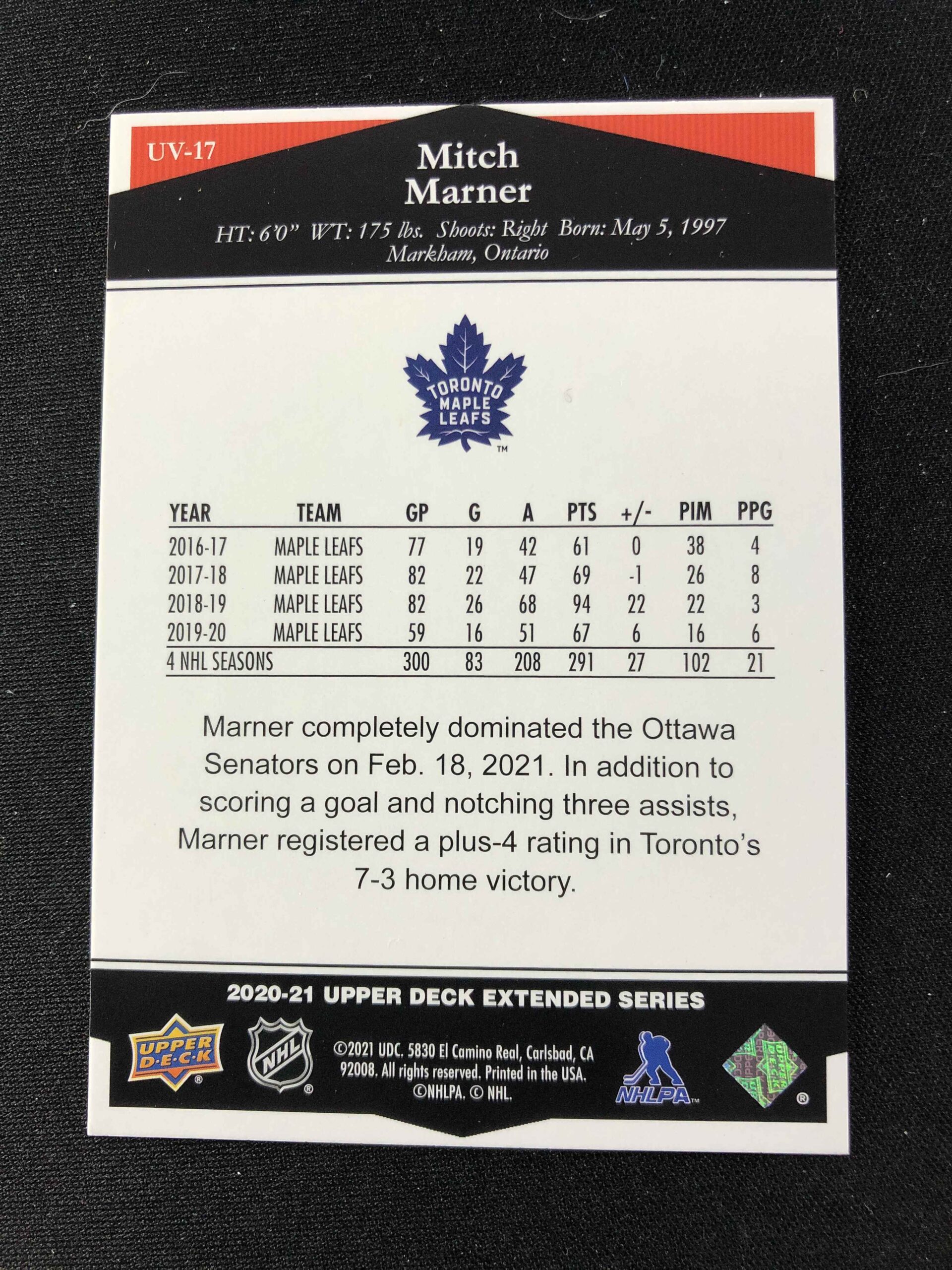 Sběratelská karta 2020/2021 Upper Deck Extended Ultimate Victory UV-47 Mitch Marner Inzert