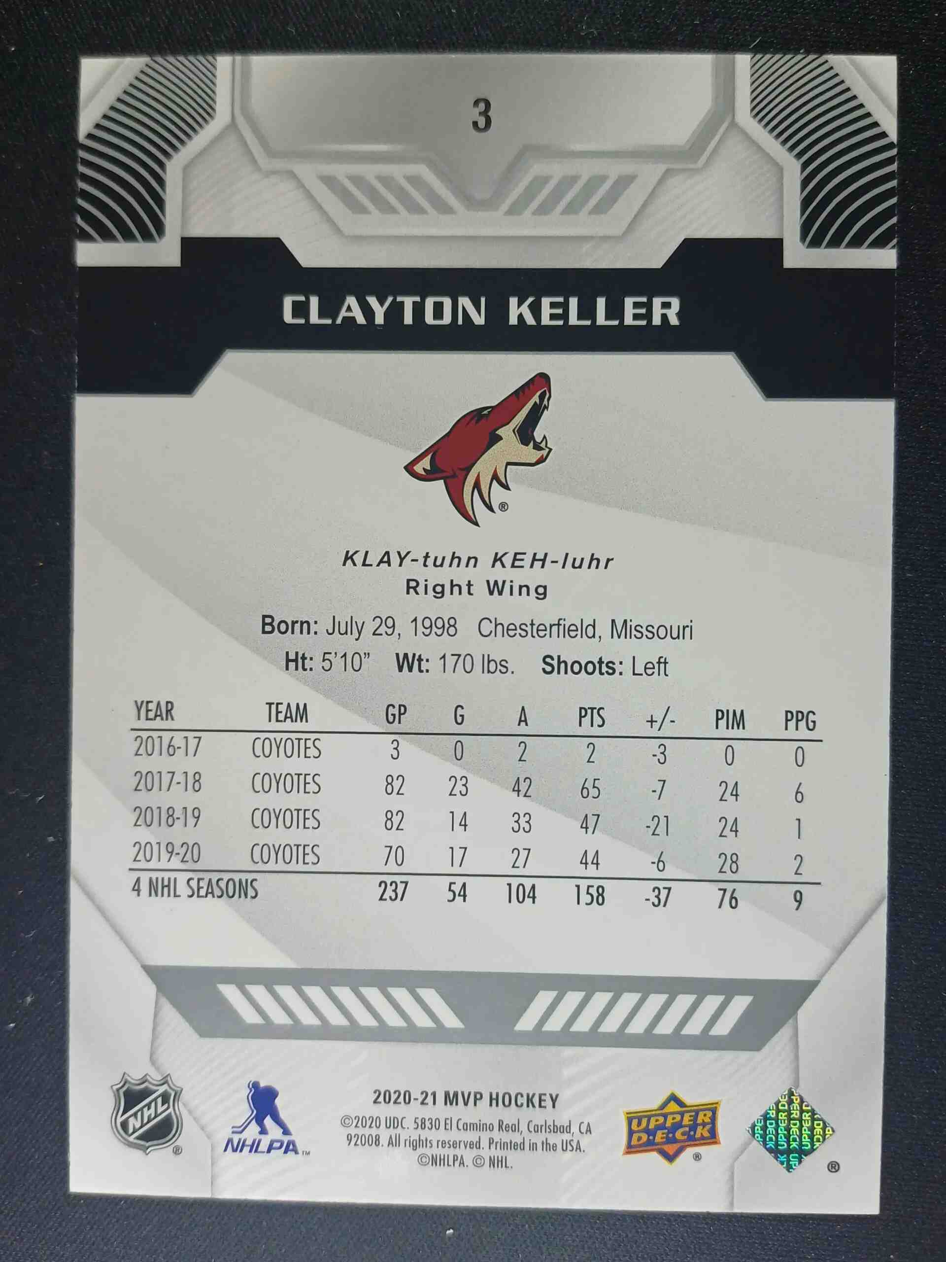Sběratelská karta 2020/2021 Upper Deck MVP Super Script 3 Clayton Keller Paralel 13/25