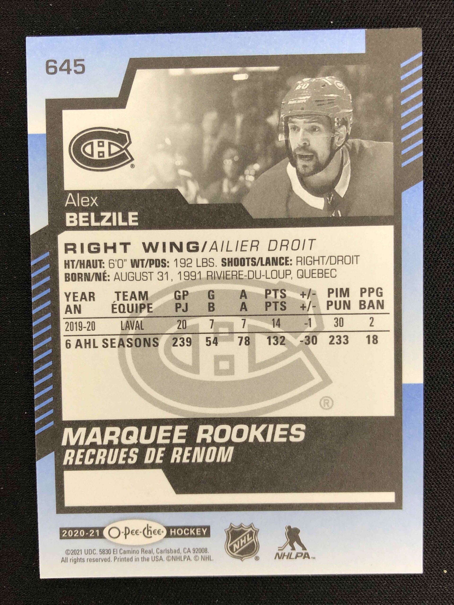 2020/2021 Upper Deck O-Pee-Chee Blue Border Marquee Rookie 645 Alex Belzile Paralel