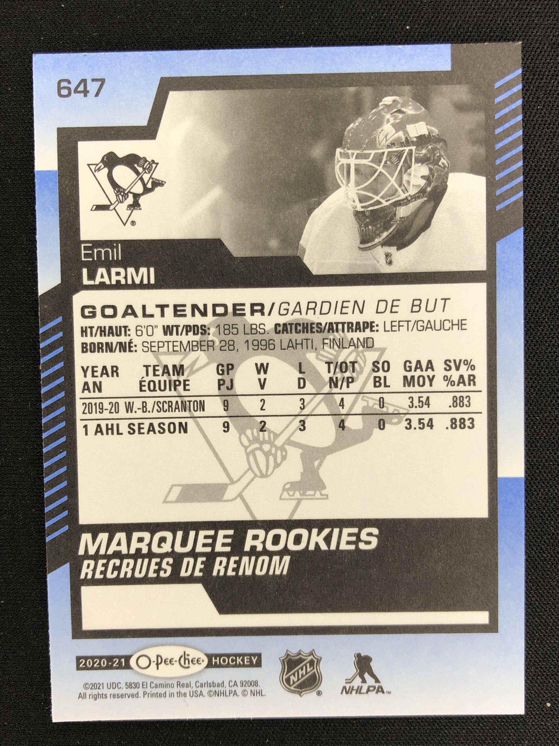 Sběratelská karta 2020/2021 Upper Deck O-Pee-Chee Blue Border Marquee Rookie 647 Emil Larmi Paralel