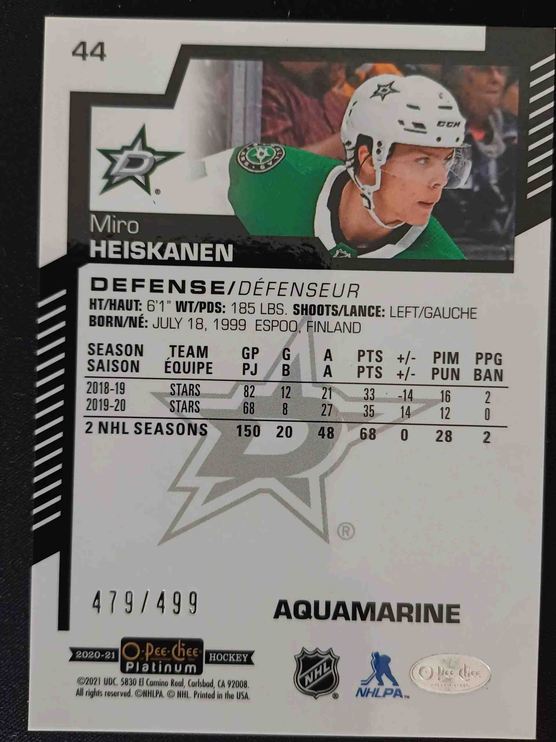 Sběratelská karta 2020/2021 Upper Deck OPC Platinum Aquamarine 44 Miro Heiskanen Paralel 479/499