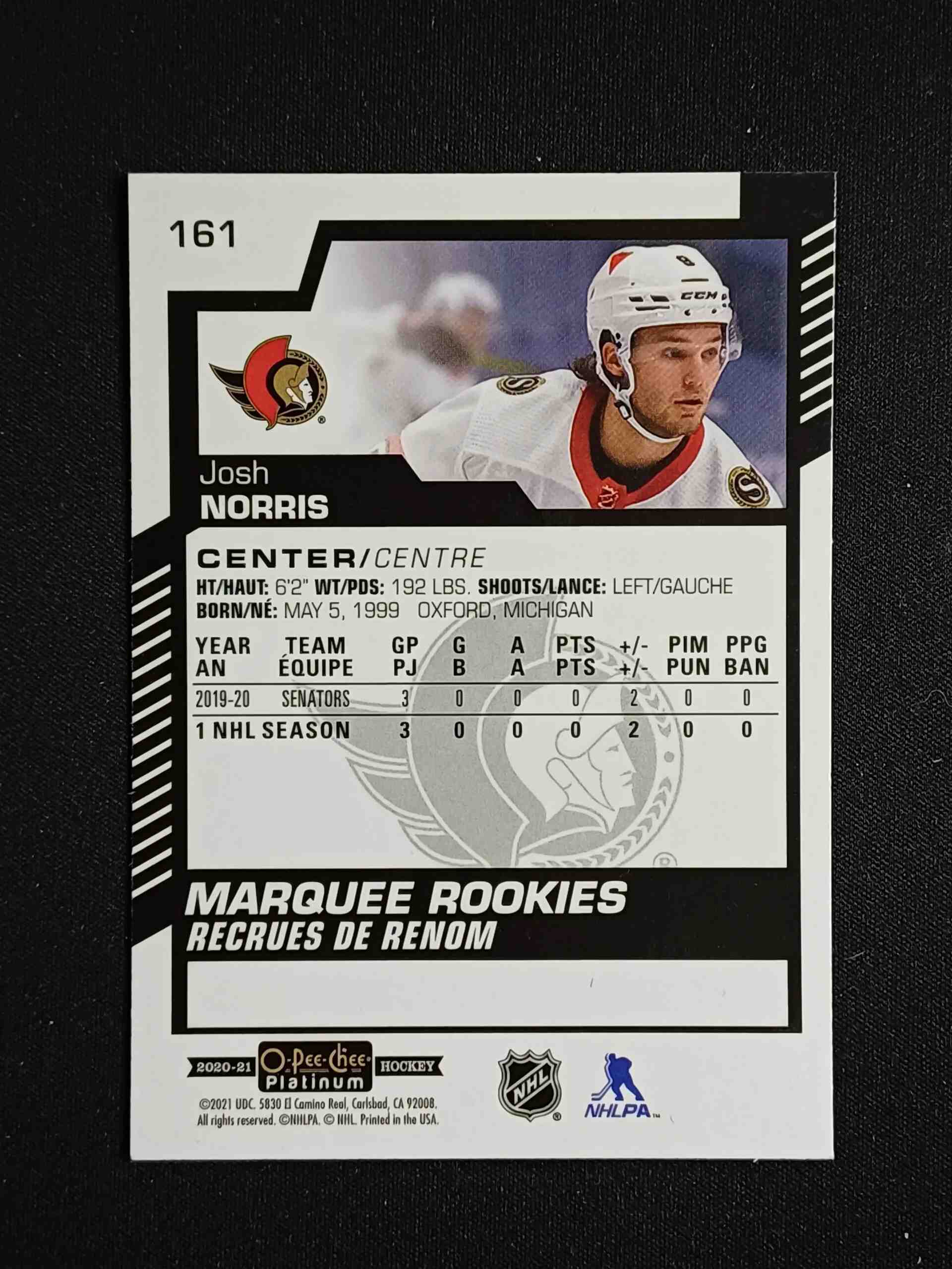 Sběratelská karta 2020/2021 Upper Deck OPC Platinum Base 161 Josh Norris