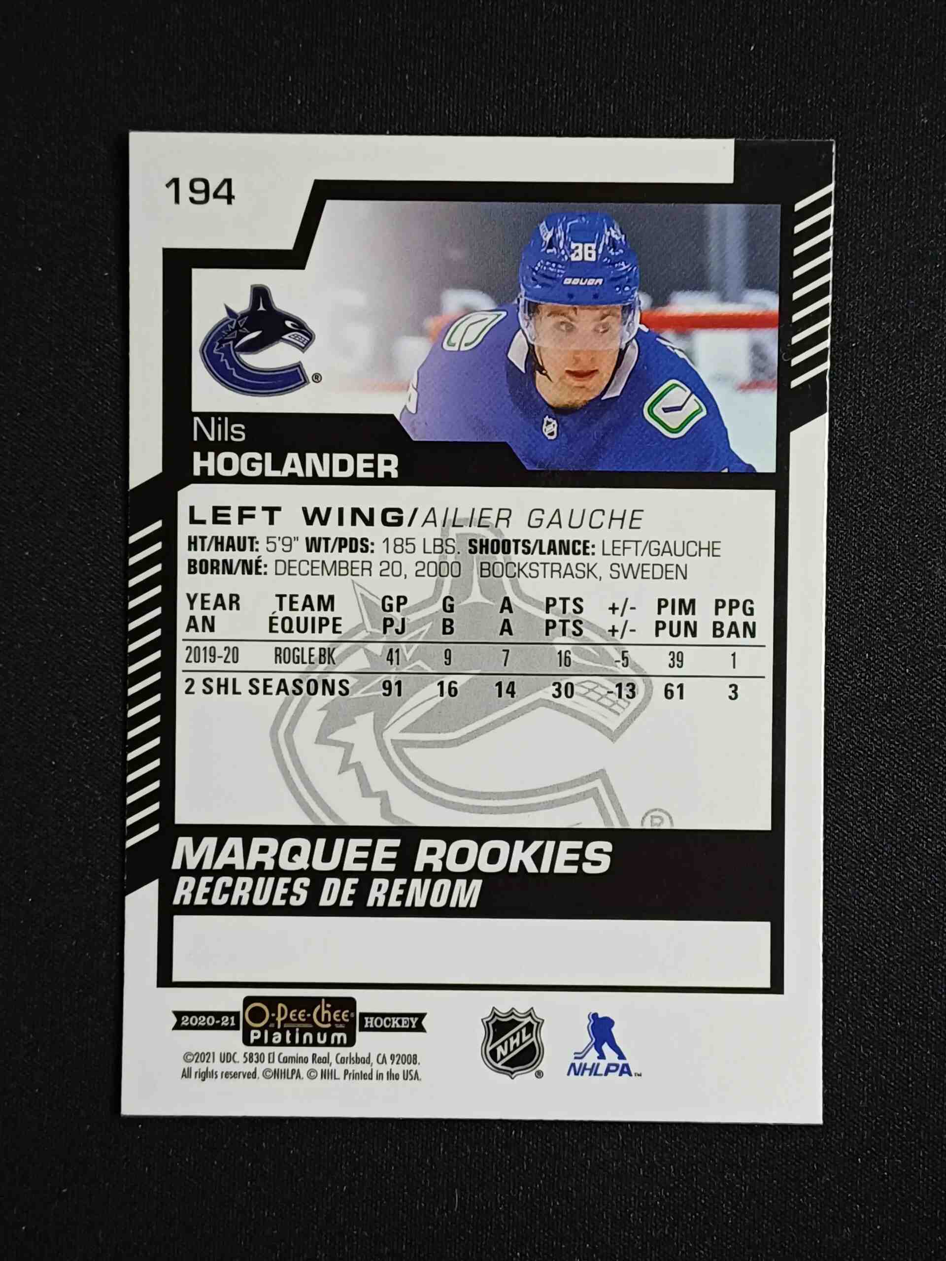 Sběratelská karta 2020/2021 Upper Deck OPC Platinum Base 194 Nils Hoglander