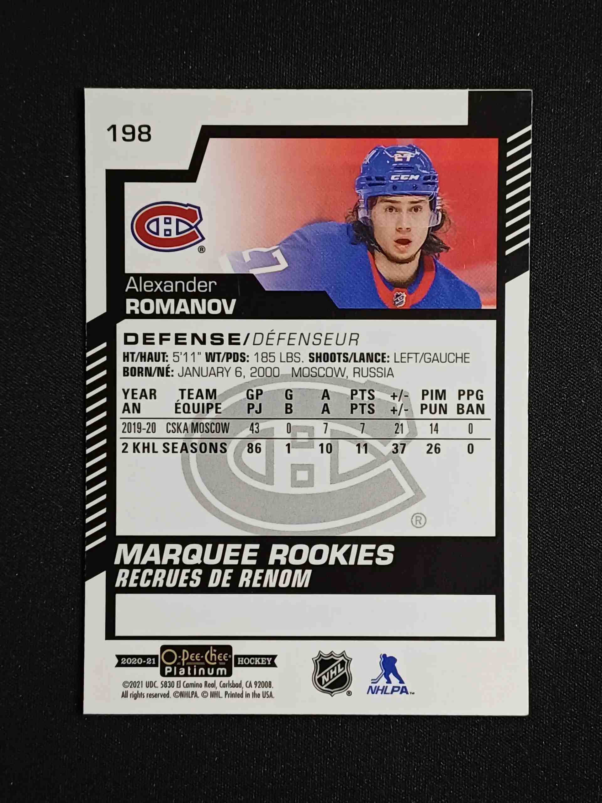Sběratelská karta 2020/2021 Upper Deck OPC Platinum Base 198 Alexander Romanov