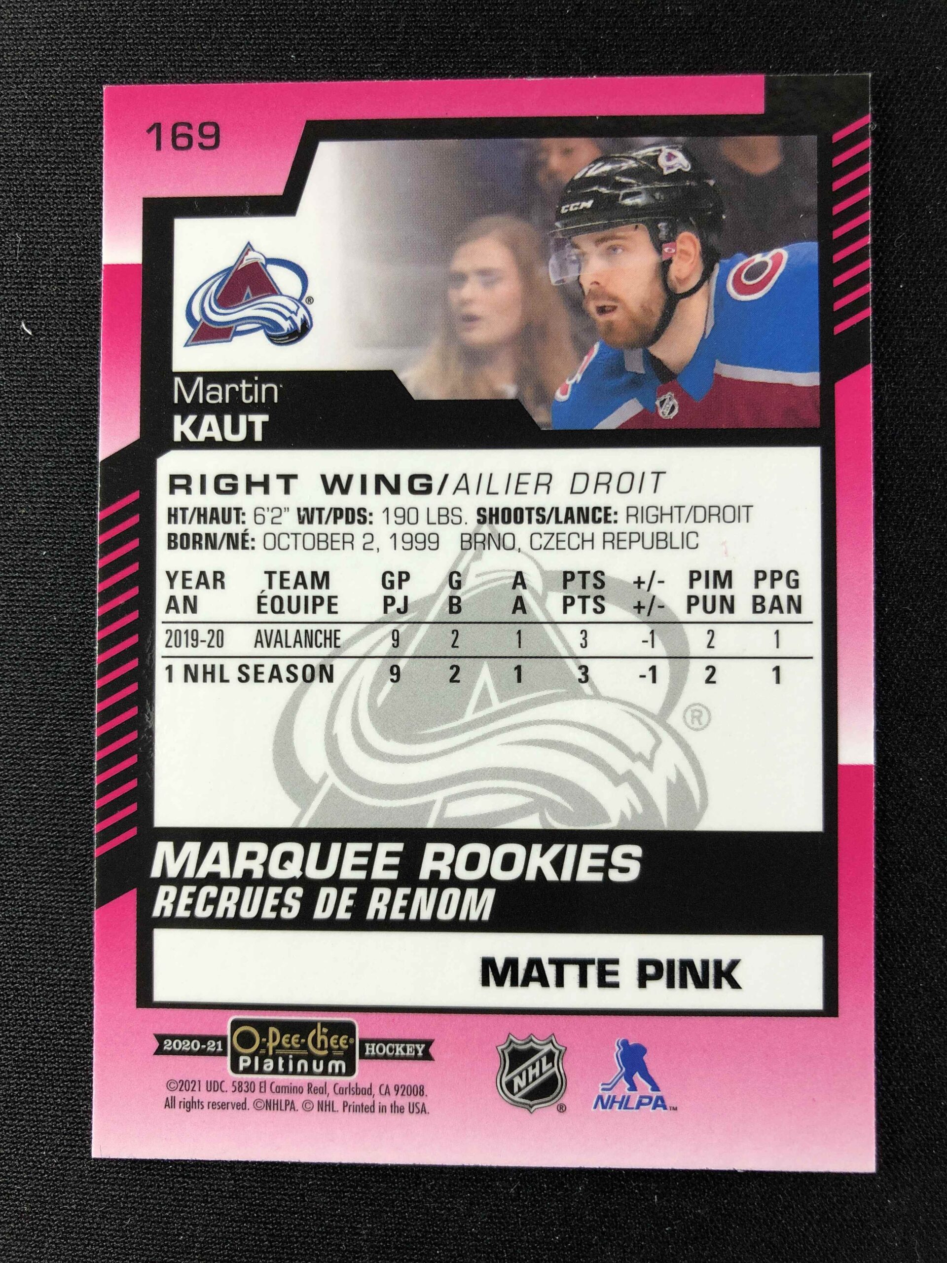 Sběratelská karta 2020/2021 Upper Deck OPC Platinum Matte Pink Marquee Rookie 169 Martin Kaut Paralel