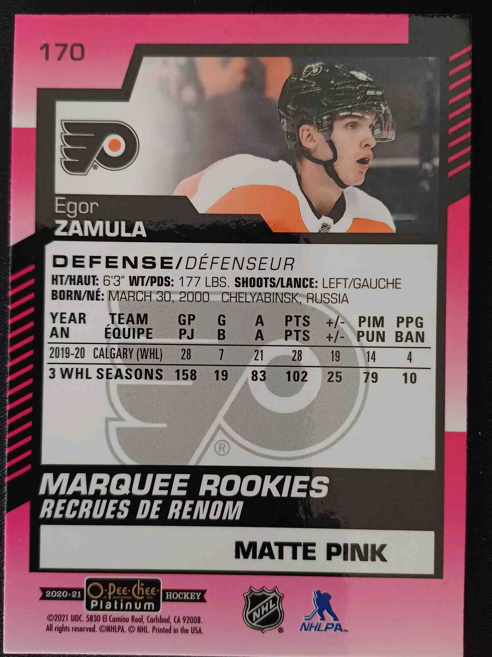 Sběratelská karta 2020/2021 Upper Deck OPC Platinum Matte Pink Marquee Rookie 170 Egor Zamula Paralel
