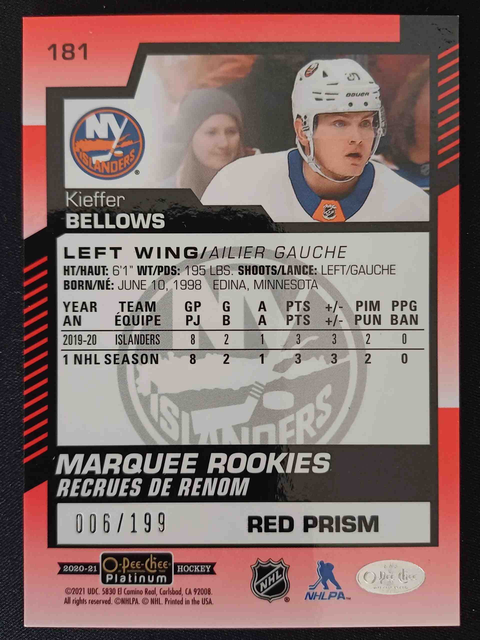 Sběratelská karta 2020/2021 Upper Deck OPC Platinum Red Prism Marquee Rookie 181 Kieffer Bellows Paralel 006/199