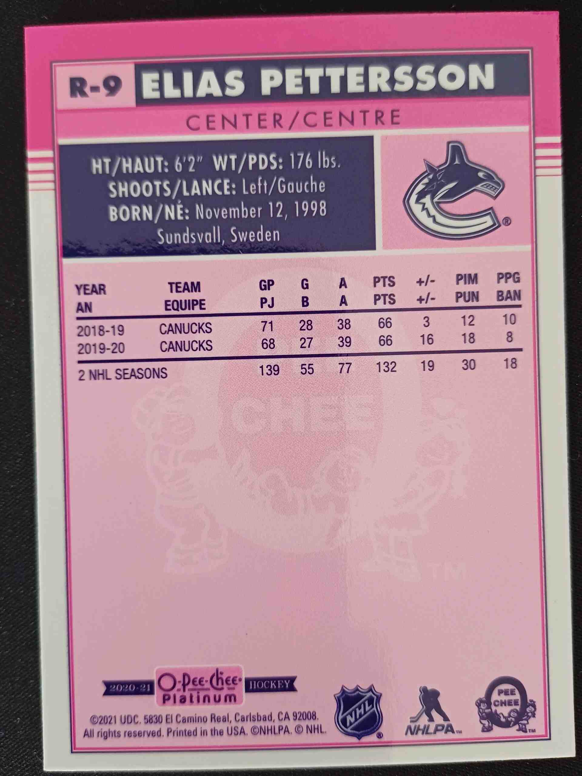 Sběratelská karta 2020/2021 Upper Deck OPC Platinum Retro R-9 Elias Pettersson Paralel