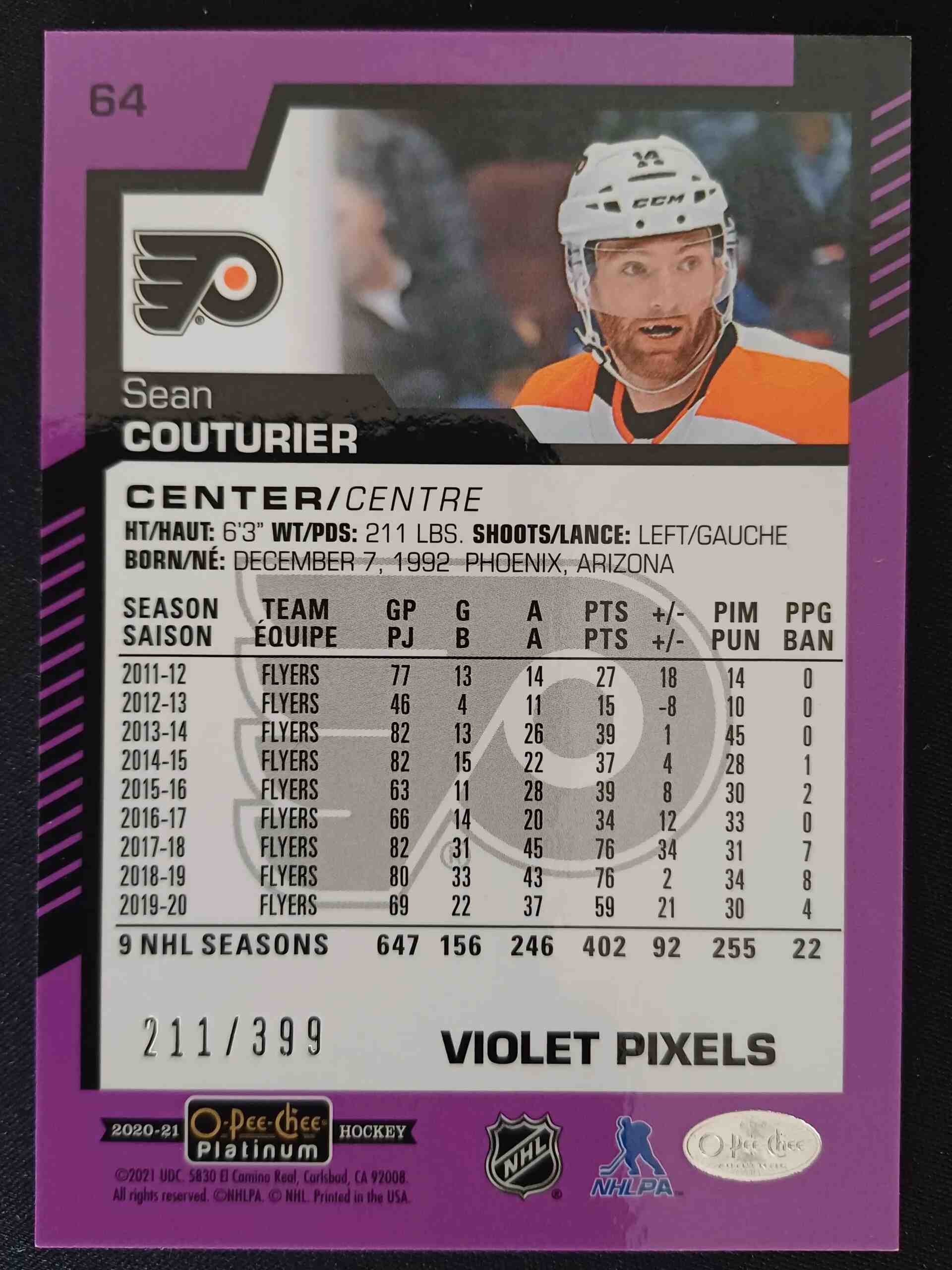 Sběratelská karta 2020/2021 Upper Deck OPC Platinum Violet Pixels 64 Sean Couturier Paralel 211/399