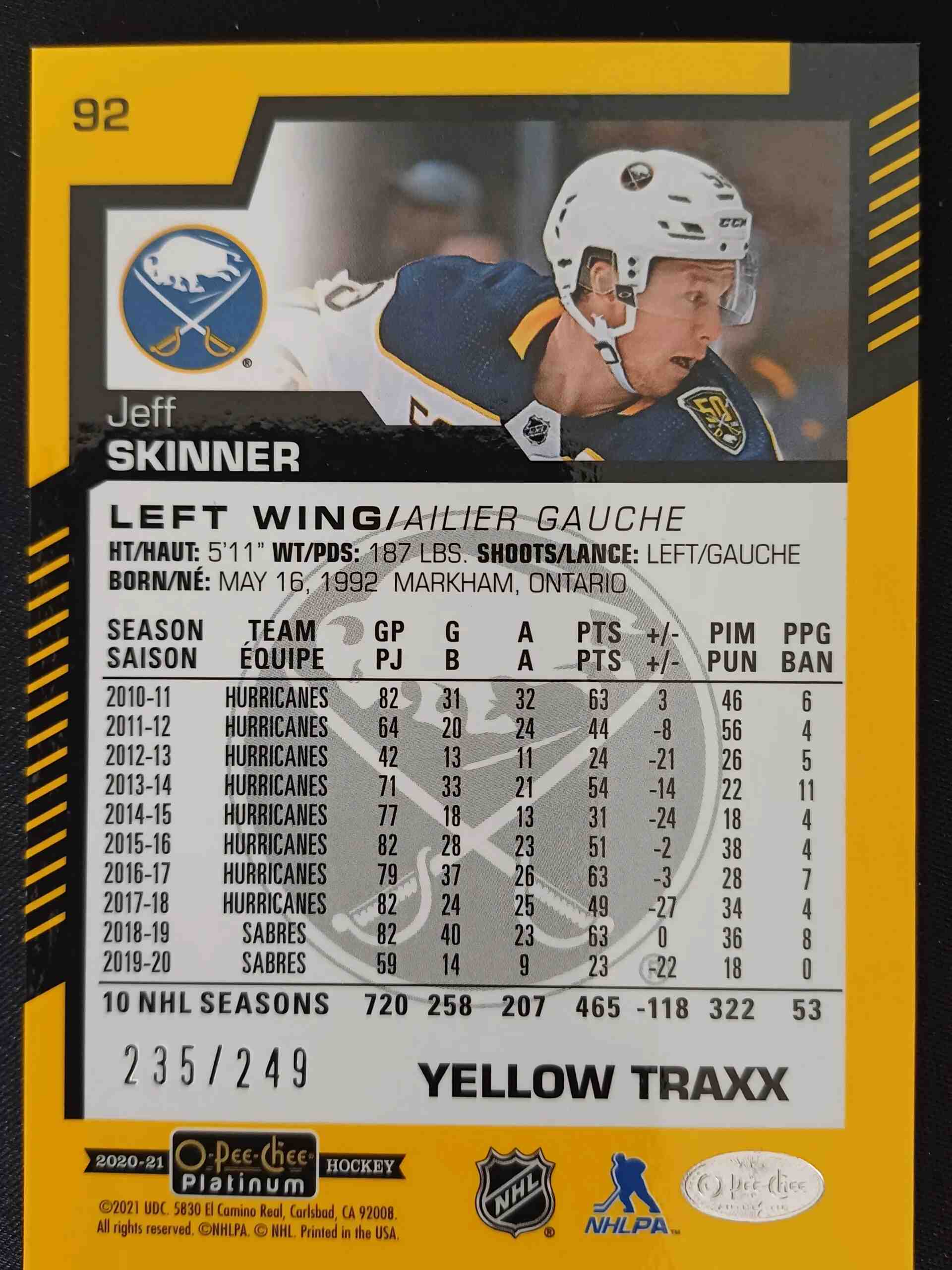2020/2021 Upper Deck OPC Platinum Yellow Traxx 92 Jeff Skinner Paralel 235/249