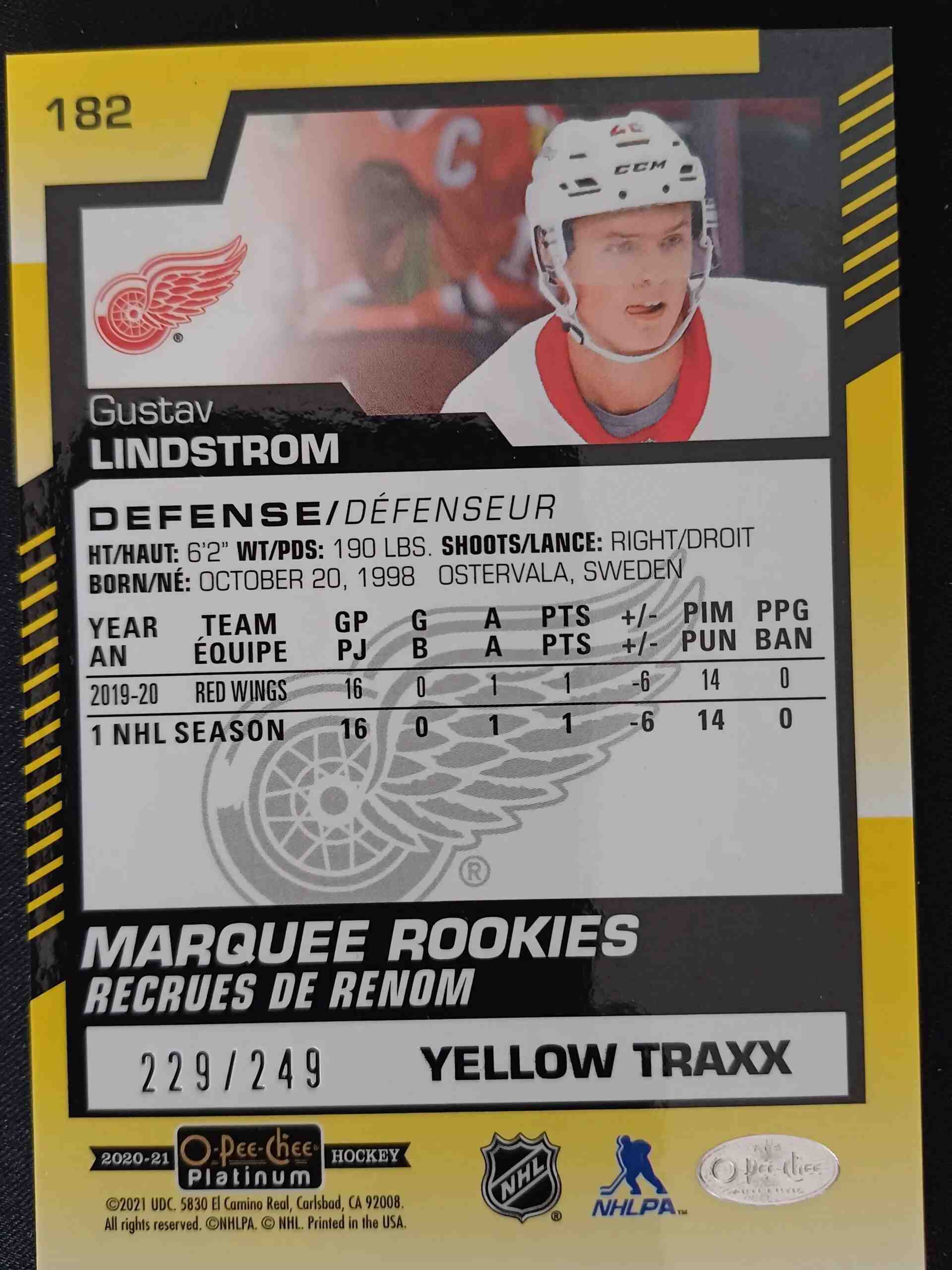 Sběratelská karta 2020/2021 Upper Deck OPC Platinum Yellow Traxx Marquee Rookie 182 Gustav Lindstrom Paralel 229/249