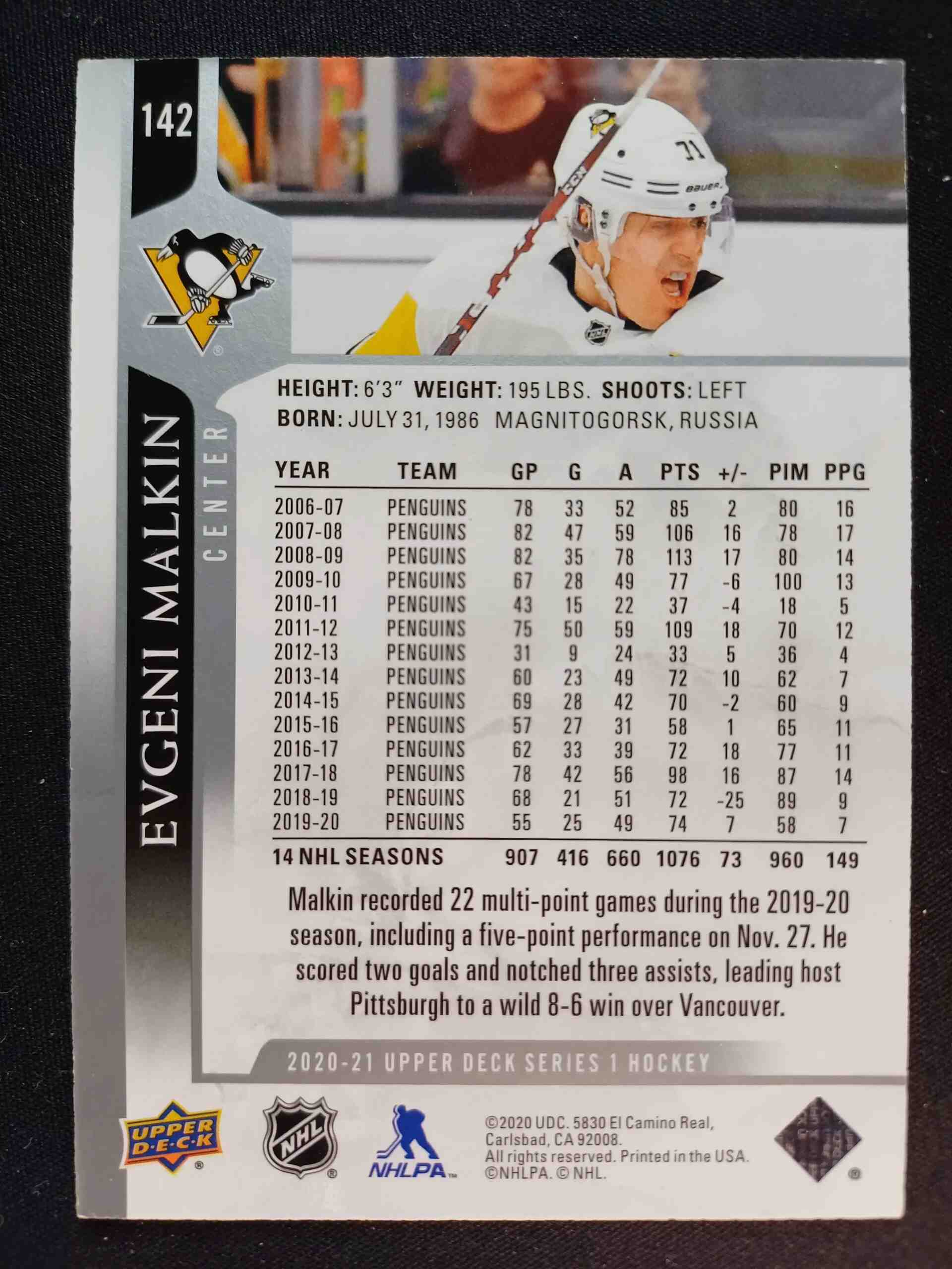 Sběratelská karta 2020/2021 Upper Deck Series 1 Base 142 Evgeni Malkin
