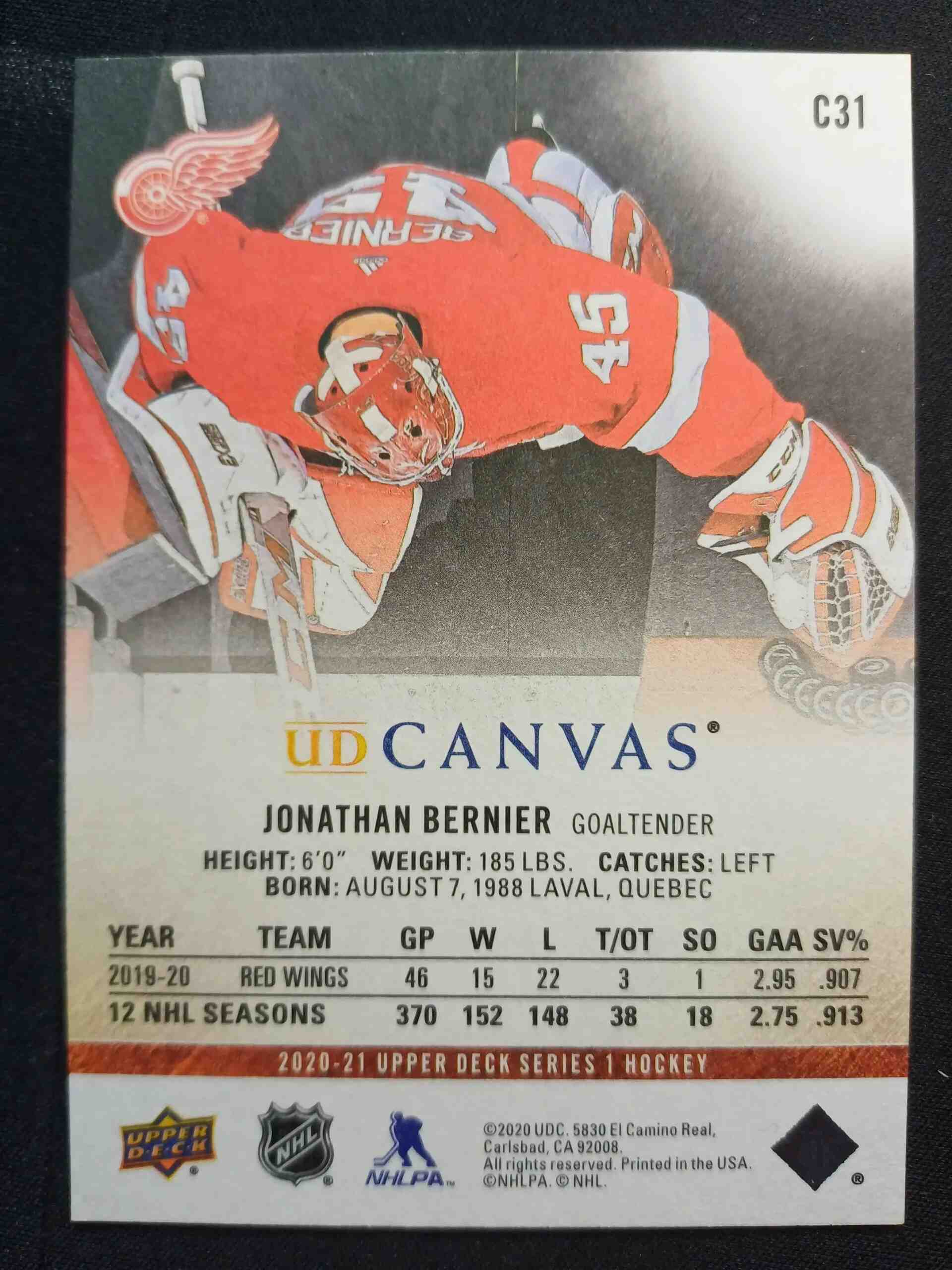 Sběratelská karta 2020/2021 Upper Deck Series 1 Canvas C31 Jonathan Bernier Inzert