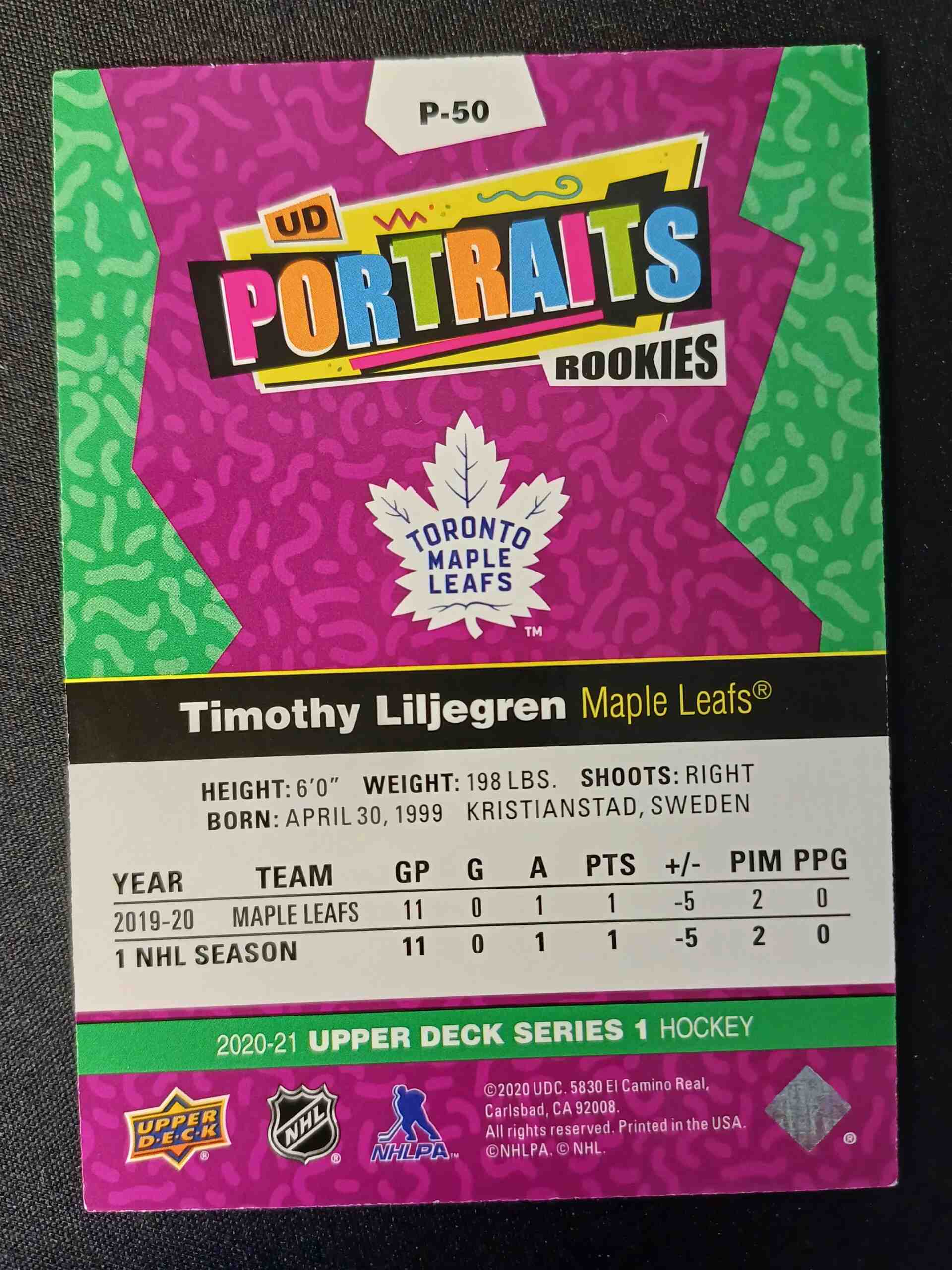 Sběratelská karta 2020/2021 Upper Deck Series 1 Portraits P-50 Timothy Liljegren Inzert