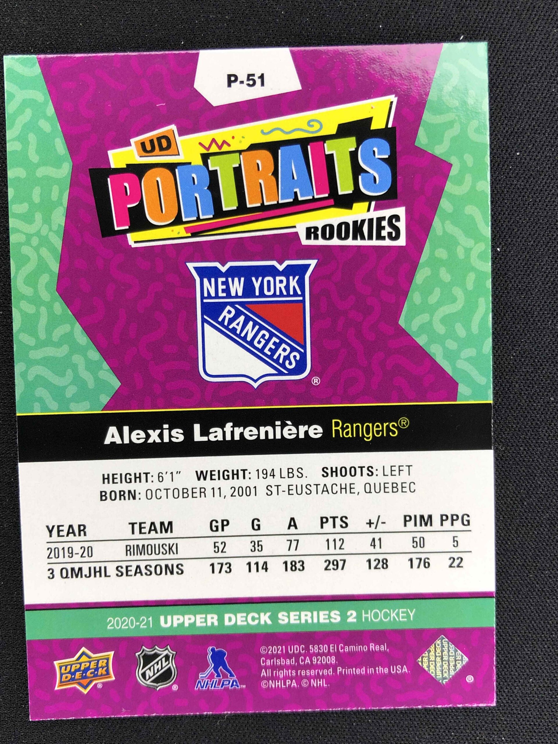 2020/2021 Upper Deck Series 2 Portraits P-51 Alexis Lafreniere Inzert