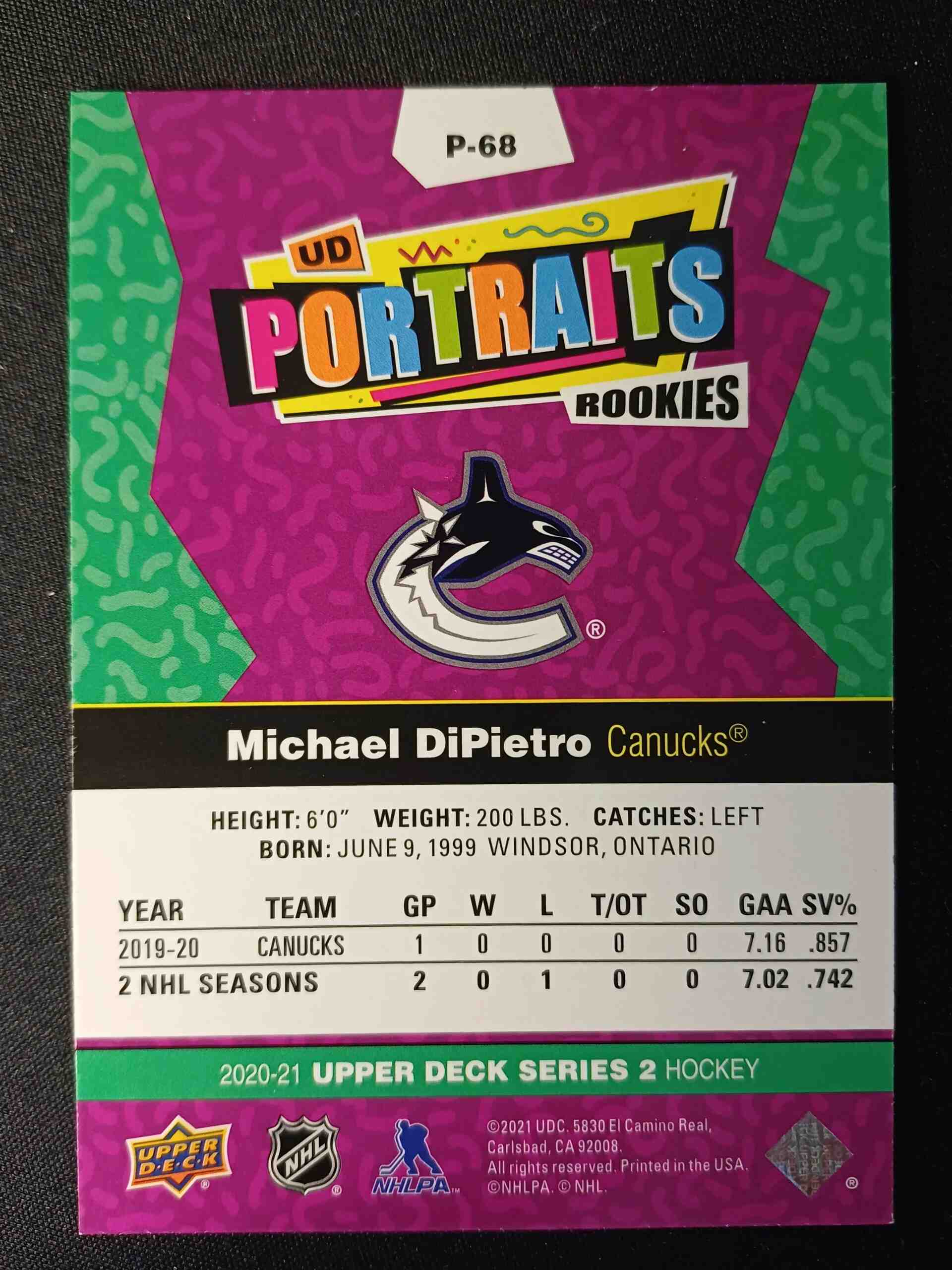 2020/2021 Upper Deck Series 2 Portraits P-68 Michael DiPietro Inzert
